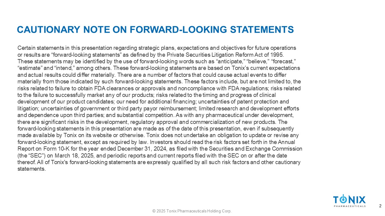 Certain statements in this presentation regarding strategic plans, expectations and objectives for future operations or results are “forward - looking statements” as defined by the Private Securities Litigation Reform Act of 1995. These statements may be identified by the use of forward - looking words such as “anticipate,” “believe,” “forecast,” “estimate” and “intend,” among others. These forward - looking statements are based on Tonix’s current expectations and actual results could differ materially. There are a number of factors that could cause actual events to differ materially from those indicated by such forward - looking statements. These factors include, but are not limited to, the risks related to failure to obtain FDA clearances or approvals and noncompliance with FDA regulations; risks related to the failure to successfully market any of our products; risks related to the timing and progress of clinical development of our product candidates; our need for additional financing; uncertainties of patent protection and litigation; uncertainties of government or third party payor reimbursement; limited research and development efforts and dependence upon third parties; and substantial competition. As with any pharmaceutical under development, there are significant risks in the development, regulatory approval and commercialization of new products. The forward - looking statements in this presentation are made as of the date of this presentation, even if subsequently made available by Tonix on its website or otherwise. Tonix does not undertake an obligation to update or revise any forward - looking statement, except as required by law. Investors should read the risk factors set forth in the Annual Report on Form 10 - K for the year ended December 31, 2024, as filed with the Securities and Exchange Commission (the “SEC”) on March 18, 2025, and periodic reports and current reports filed with the SEC on or after the date thereof. All of Tonix's forward - looking statements are expressly qualified by all such risk factors and other cautionary statements. 2 © 2025 Tonix Pharmaceuticals Holding Corp.