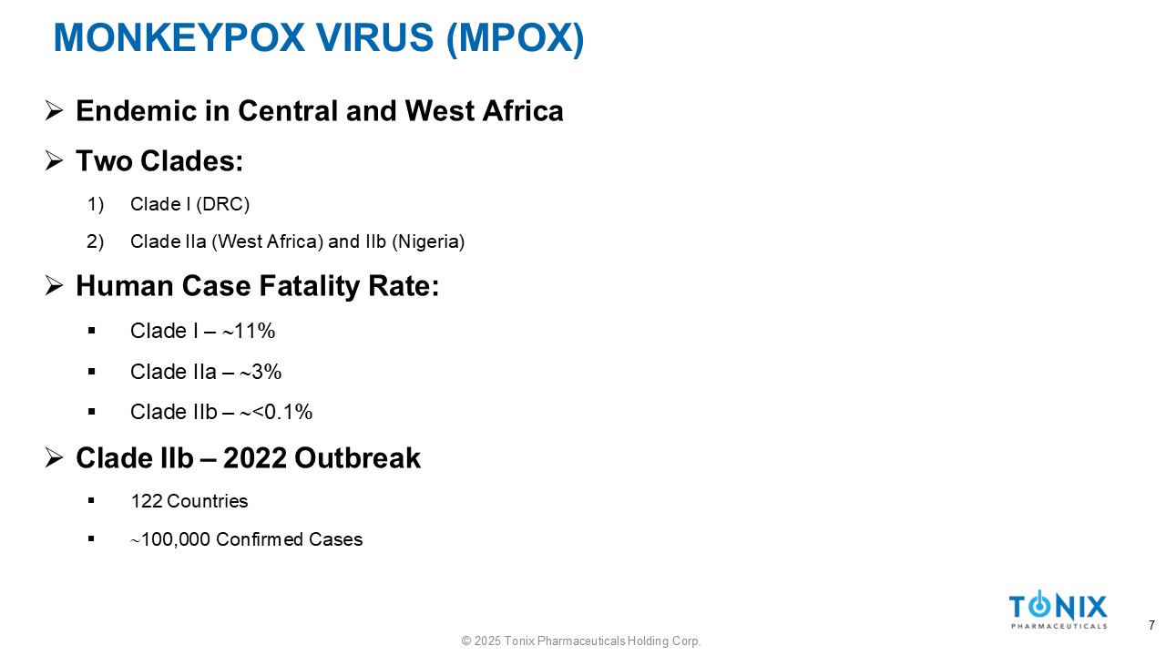 GENUS ORTHOPOXVIRUS 6 © 2025 Tonix Pharmaceuticals Holding Corp.