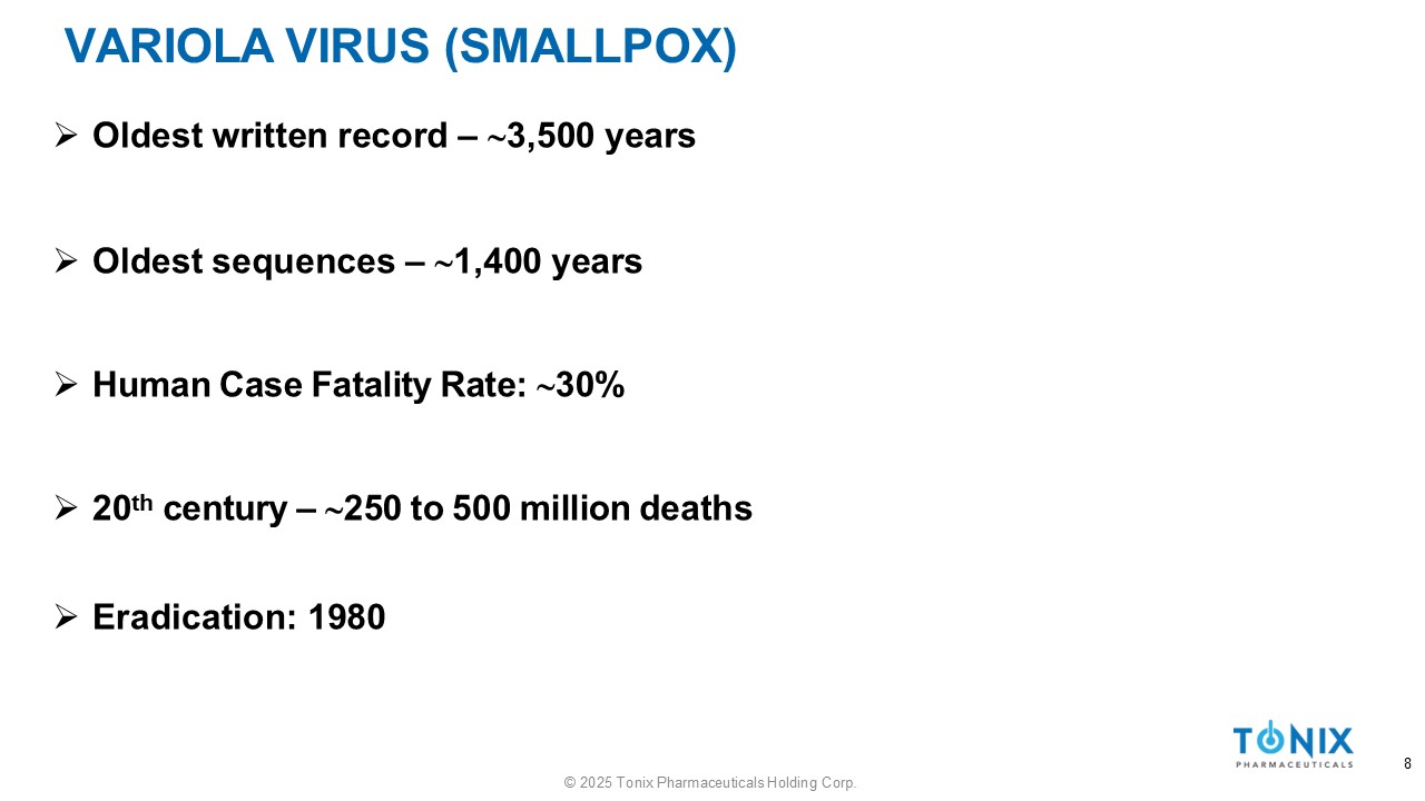 MONKEYPOX VIRUS (MPOX) 7 © 2025 Tonix Pharmaceuticals Holding Corp. » Endemic in Central and West Africa » Two Clades: 1) Clade I (DRC) 2) Clade IIa (West Africa) and IIb (Nigeria) » Human Case Fatality Rate: ▪ Clade I –  11% ▪ Clade IIa –  3% ▪ Clade IIb –  <0.1% » Clade IIb – 2022 Outbreak ▪ 122 Countries ▪  100,000 Confirmed Cases