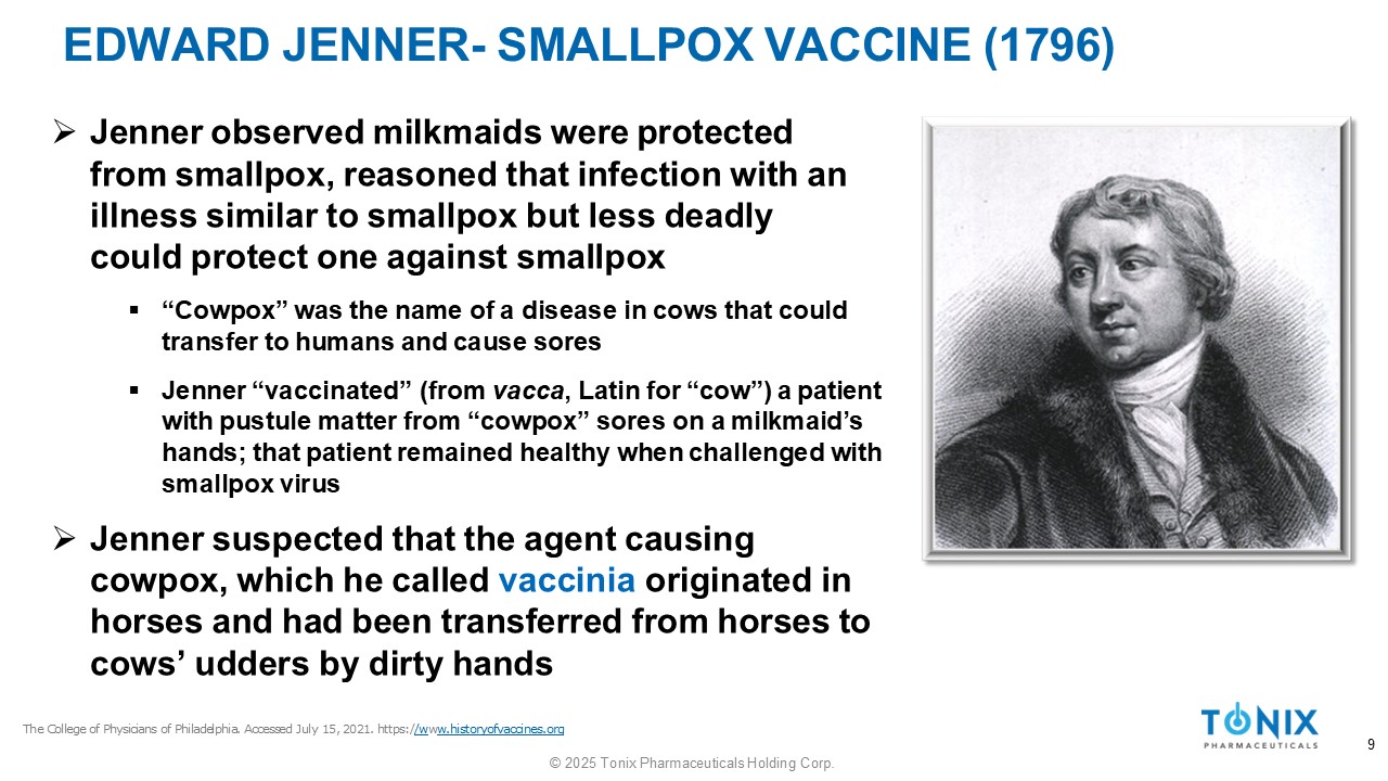EDWARD JENNER - SMALLPOX VACCINE (1796) » Jenner observed milkmaids were protected from smallpox, reasoned that infection with an illness similar to smallpox but less deadly could protect one against smallpox ▪ “Cowpox” was the name of a disease in cows that could transfer to humans and cause sores ▪ Jenner “vaccinated” (from vacca , Latin for “cow”) a patient with pustule matter from “cowpox” sores on a milkmaid’s hands; that patient remained healthy when challenged with smallpox virus » Jenner suspected that the agent causing cowpox, which he called vaccinia originated in horses and had been transferred from horses to cows’ udders by dirty hands The College of Physicians of Philadelphia. Accessed July 15, 2021. https:/ /w w w.historyofvaccines.org 9 © 2025 Tonix Pharmaceuticals Holding Corp.
