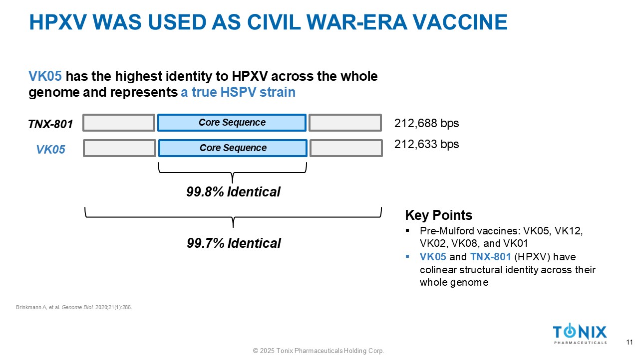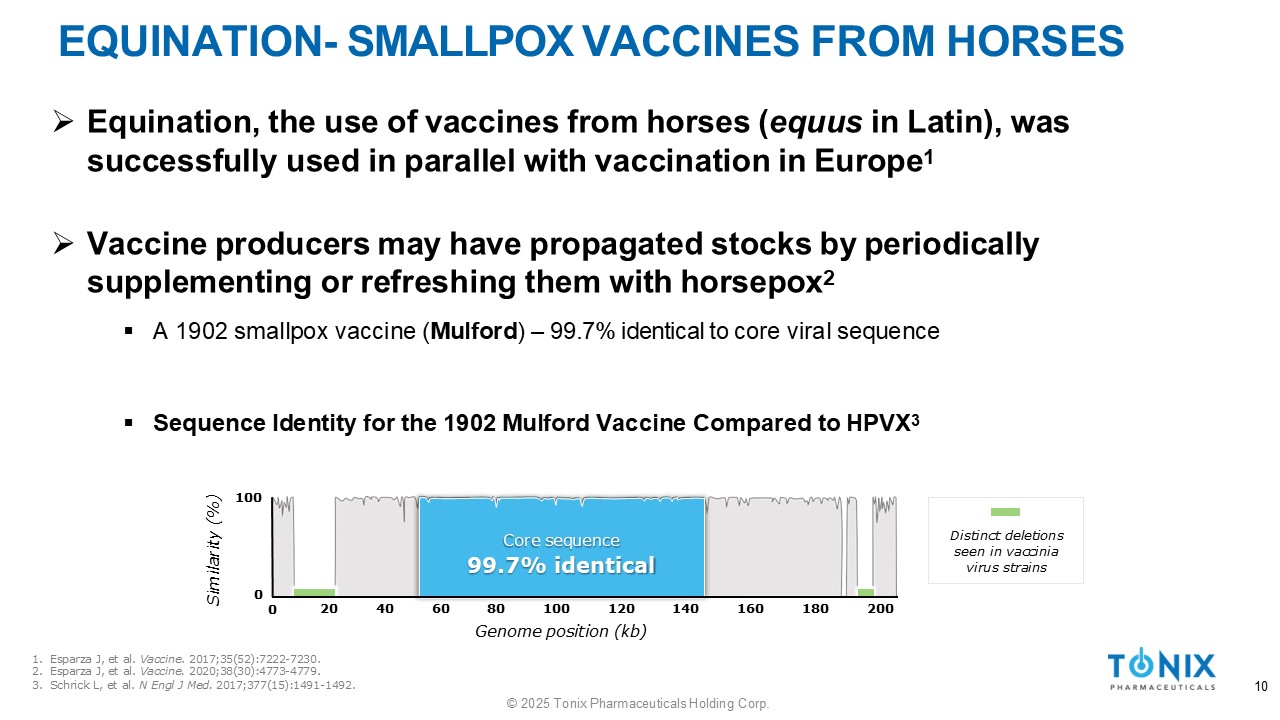 EQUINATION - SMALLPOX VACCINES FROM HORSES » Equination, the use of vaccines from horses ( equus in Latin), was successfully used in parallel with vaccination in Europe 1 » Vaccine producers may have propagated stocks by periodically supplementing or refreshing them with horsepox 2 ▪ A 1902 smallpox vaccine ( Mulford ) – 99.7% identical to core viral sequence ▪ Sequence Identity for the 1902 Mulford Vaccine Compared to HPVX 3 Similarity (%) 100 20 40 60 Core sequence 99.7% identical 80 100 120 Genome position (kb) 140 160 180 200 0 0 Distinct deletions seen in vaccinia virus strains 1. Esparza J, et al. Vaccine . 2017;35(52):7222 - 7230. 2. Esparza J, et al. Vaccine. 2020;38(30):4773 - 4779. 3. Schrick L, et al. N Engl J Med. 2017;377(15):1491 - 1492. 10 © 2025 Tonix Pharmaceuticals Holding Corp.