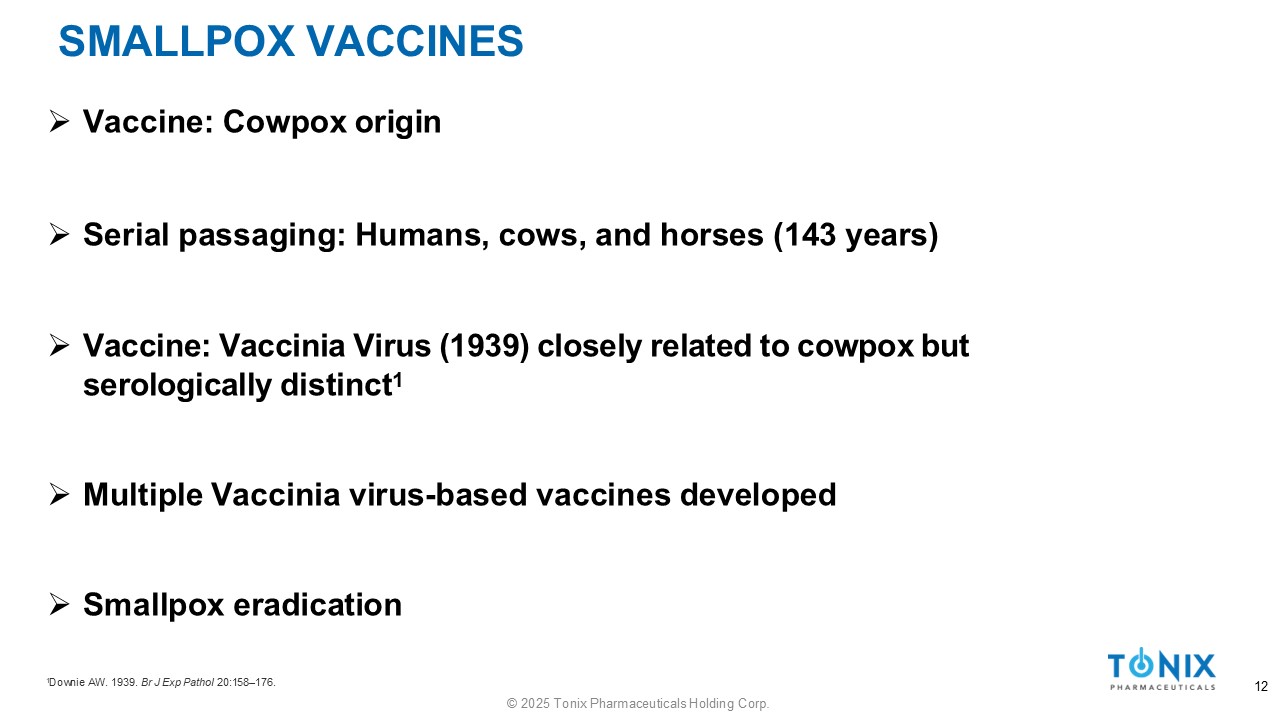 SMALLPOX VACCINES 1 Downie AW. 1939. Br J Exp Pathol 20:158 – 176. 12 © 2025 Tonix Pharmaceuticals Holding Corp. » Vaccine: Cowpox origin » Serial passaging: Humans, cows, and horses (143 years) » Vaccine: Vaccinia Virus (1939) closely related to cowpox but serologically distinct 1 » Multiple Vaccinia virus - based vaccines developed » Smallpox eradication