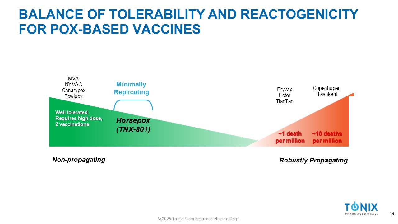 BALANCE OF TOLERABILITY AND REACTOGENICITY FOR POX - BASED VACCINES Well tolerated, Requires high dose, 2 vaccinations ~1 death per million ~10 deaths per million Non - propagating 13 © 2025 Tonix Pharmaceuticals Holding Corp. Robustly Propagating Dryvax Lister TianTan Copenhagen Tashkent MVA NYVAC Canarypox Fowlpox Focus Generation of Replication Deficient
