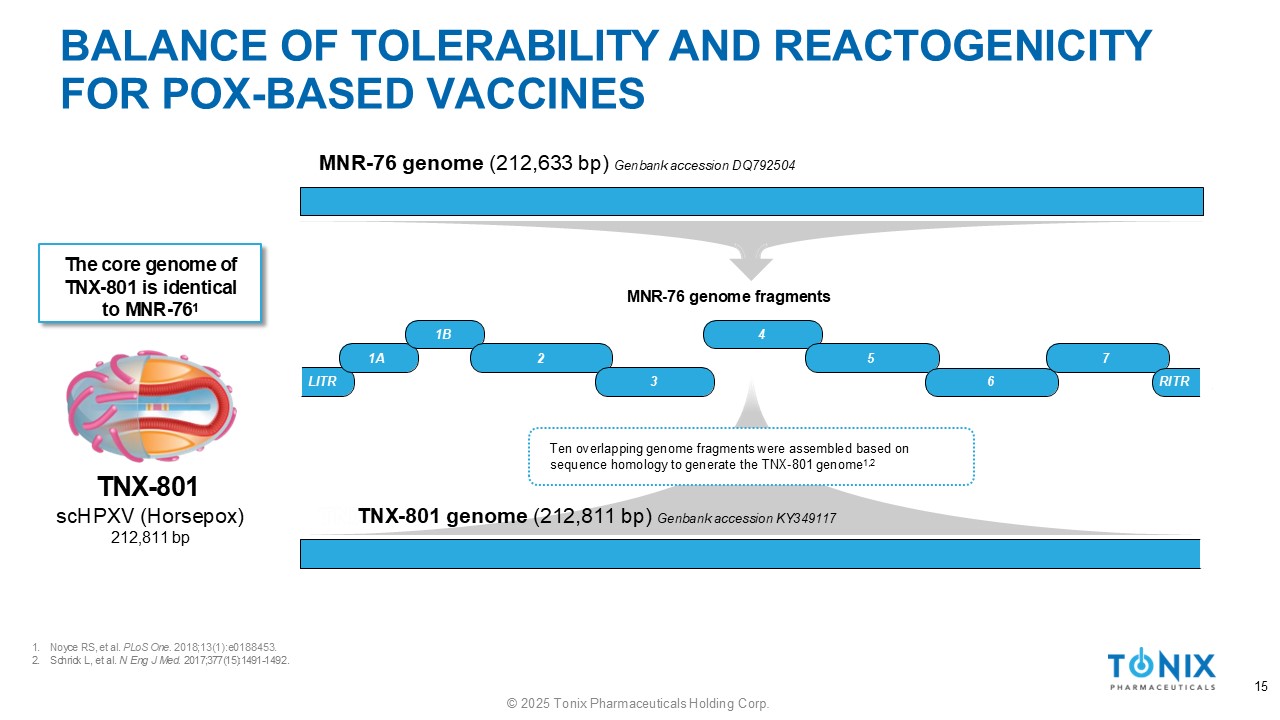 BALANCE OF TOLERABILITY AND REACTOGENICITY FOR POX - BASED VACCINES Well tolerated, Requires high dose, 2 vaccinations ~1 death per million ~10 deaths per million Non - propagating 14 © 2025 Tonix Pharmaceuticals Holding Corp. Robustly Propagating Dryvax Lister TianTan Copenhagen Tashkent MVA NYVAC Canarypox Fowlpox Minimally Replicating Horsepox (TNX - 801)