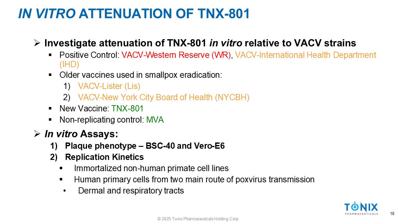IN VITRO ATTENUATION OF TNX - 801 18 © 2025 Tonix Pharmaceuticals Holding Corp. » Investigate attenuation of TNX - 801 in vitro relative to VACV strains ▪ Positive Control: VACV - Western Reserve (WR) , VACV - International Health Department (IHD) ▪ Older vaccines used in smallpox eradication: 1) VACV - Lister (Lis) 2) VACV - New York City Board of Health (NYCBH) ▪ New Vaccine: TNX - 801 ▪ Non - replicating control: MVA » In vitro Assays: 1) Plaque phenotype – BSC - 40 and Vero - E6 2) Replication Kinetics ▪ Immortalized non - human primate cell lines ▪ Human primary cells from two main route of poxvirus transmission • Dermal and respiratory tracts