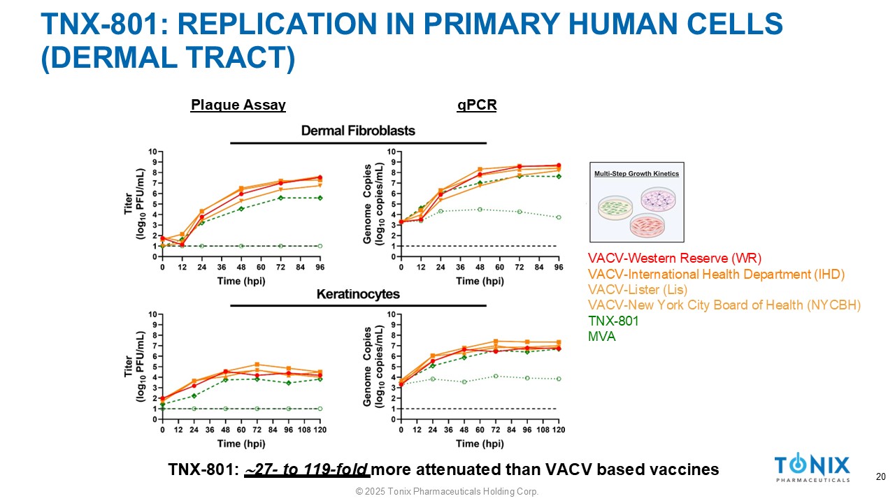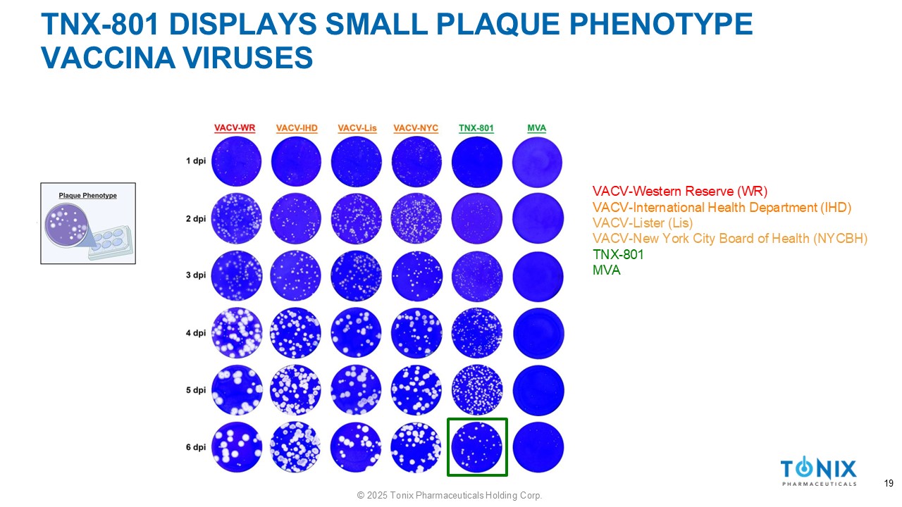 TNX - 801 DISPLAYS SMALL PLAQUE PHENOTYPE VACCINA VIRUSES VACV - Western Reserve (WR) VACV - International Health Department (IHD) VACV - Lister (Lis) VACV - New York City Board of Health (NYCBH) TNX - 801 MVA 19 © 2025 Tonix Pharmaceuticals Holding Corp.