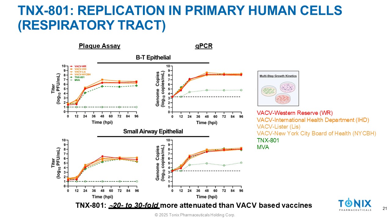 TNX - 801: REPLICATION IN PRIMARY HUMAN CELLS (DERMAL TRACT) Plaque Assay qPCR VACV - Western Reserve (WR) VACV - International Health Department (IHD) VACV - Lister (Lis) VACV - New York City Board of Health (NYCBH) TNX - 801 MVA TNX - 801:  27 - to 119 - fold more attenuated than VACV based vaccines © 2025 Tonix Pharmaceuticals Holding Corp. 20