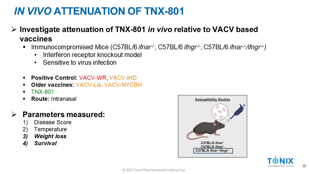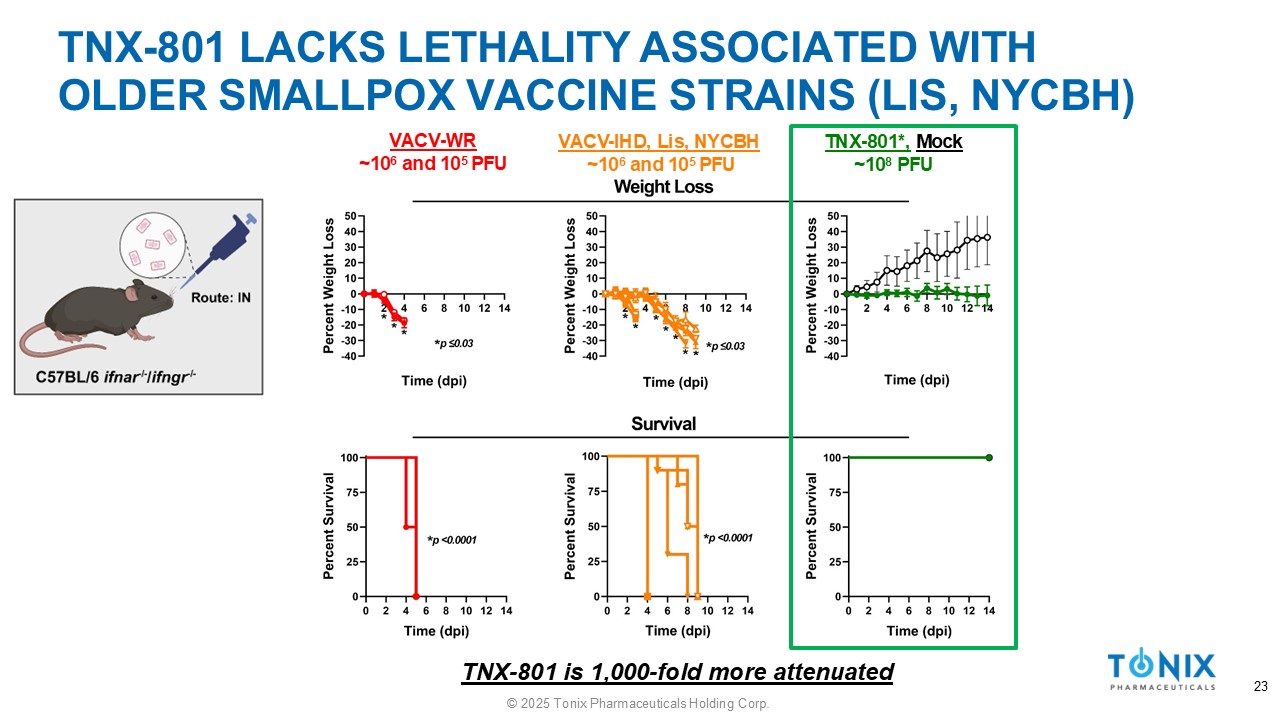 IN VIVO ATTENUATION OF TNX - 801 » Investigate attenuation of TNX - 801 in vivo relative to VACV based vaccines ▪ Immunocompromised Mice (C57BL/6 ifnar - / - , C57BL/6 ifngr - / - , C57BL/6 ifnar - / - /ifngr - / - ) • Interferon receptor knockout model • Sensitive to virus infection ▪ Positive Control: VACV - WR , VACV - IHD ▪ Older vaccines: VACV - Lis, VACV - NYCBH ▪ TNX - 801 ▪ Route: Intranasal » Parameters measured: 1) Disease Score 2) Temperature 3) Weight loss 4) Survival 22 © 2025 Tonix Pharmaceuticals Holding Corp.