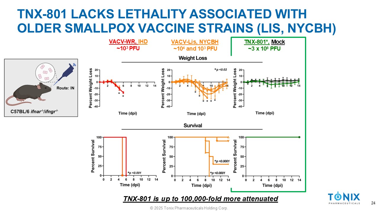 TNX - 801 LACKS LETHALITY ASSOCIATED WITH OLDER SMALLPOX VACCINE STRAINS (LIS, NYCBH) TNX - 801*, Mock ~10 8 PFU VACV - IHD, Lis, NYCBH ~10 6 and 10 5 PFU VACV - WR ~10 6 and 10 5 PFU TNX - 801 is 1,000 - fold more attenuated 23 © 2025 Tonix Pharmaceuticals Holding Corp.