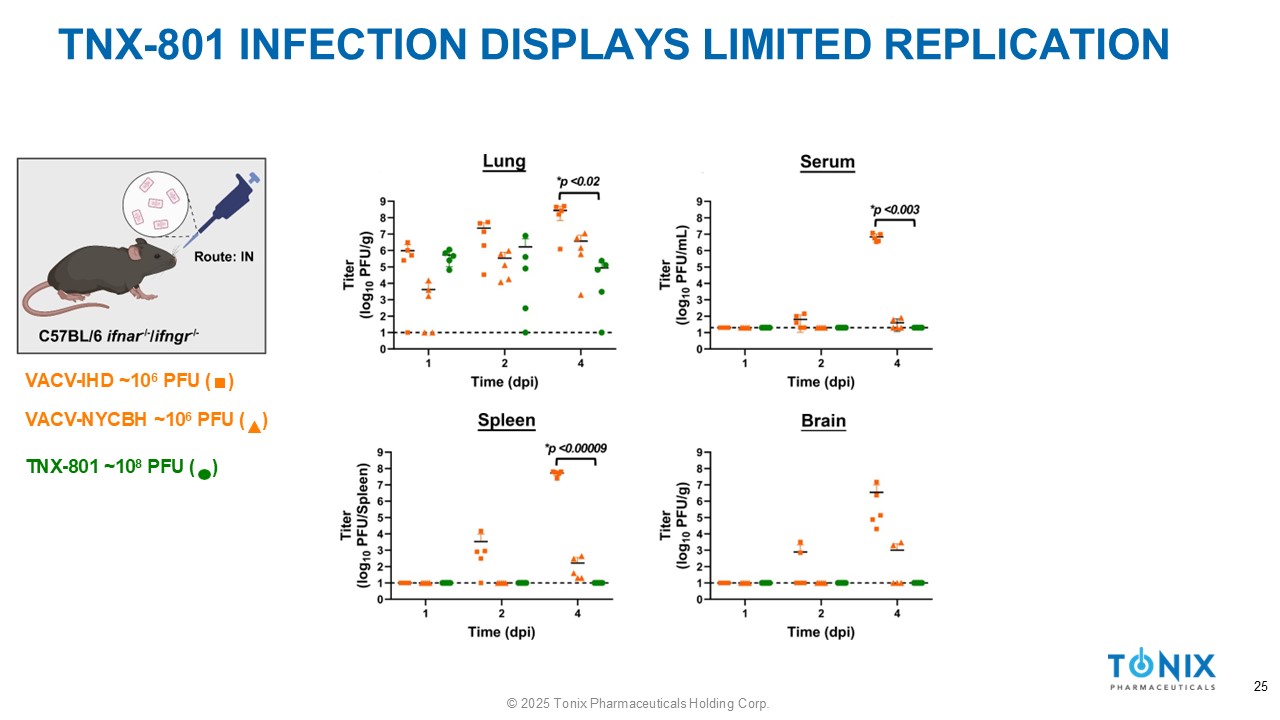 TNX - 801 LACKS LETHALITY ASSOCIATED WITH OLDER SMALLPOX VACCINE STRAINS (LIS, NYCBH) TNX - 801*, Mock ~3 x 10 8 PFU VACV - Lis, NYCBH ~10 4 and 10 3 PFU VACV - WR, IHD ~10 3 PFU TNX - 801 is up to 100,000 - fold more attenuated 24 © 2025 Tonix Pharmaceuticals Holding Corp.