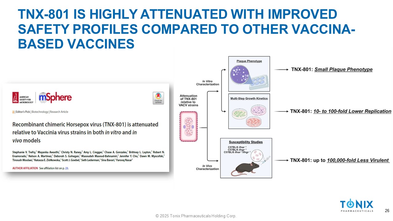 TNX - 801 INFECTION DISPLAYS LIMITED REPLICATION VACV - IHD ~10 6 PFU ( ) VACV - NYCBH ~10 6 PFU ( ) TNX - 801 ~10 8 PFU ( ) 25 © 2025 Tonix Pharmaceuticals Holding Corp.