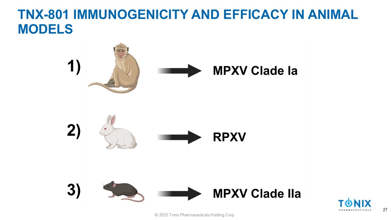 TNX - 801 IMMUNOGENICITY AND EFFICACY IN ANIMAL MODELS 1) 2) 3) 27 © 2025 Tonix Pharmaceuticals Holding Corp.