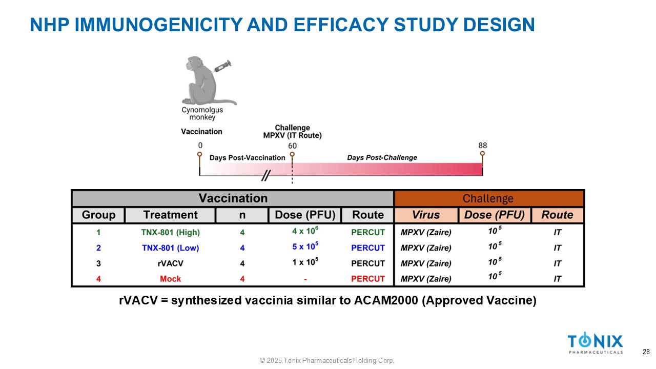 NHP IMMUNOGENICITY AND EFFICACY STUDY DESIGN rVACV = synthesized vaccinia similar to ACAM2000 (Approved Vaccine) 28 © 2025 Tonix Pharmaceuticals Holding Corp.