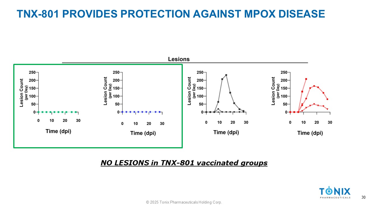 TNX - 801 PROVIDES PROTECTION AGAINST MPOX DISEASE NO LESIONS in TNX - 801 vaccinated groups 30 © 2025 Tonix Pharmaceuticals Holding Corp.