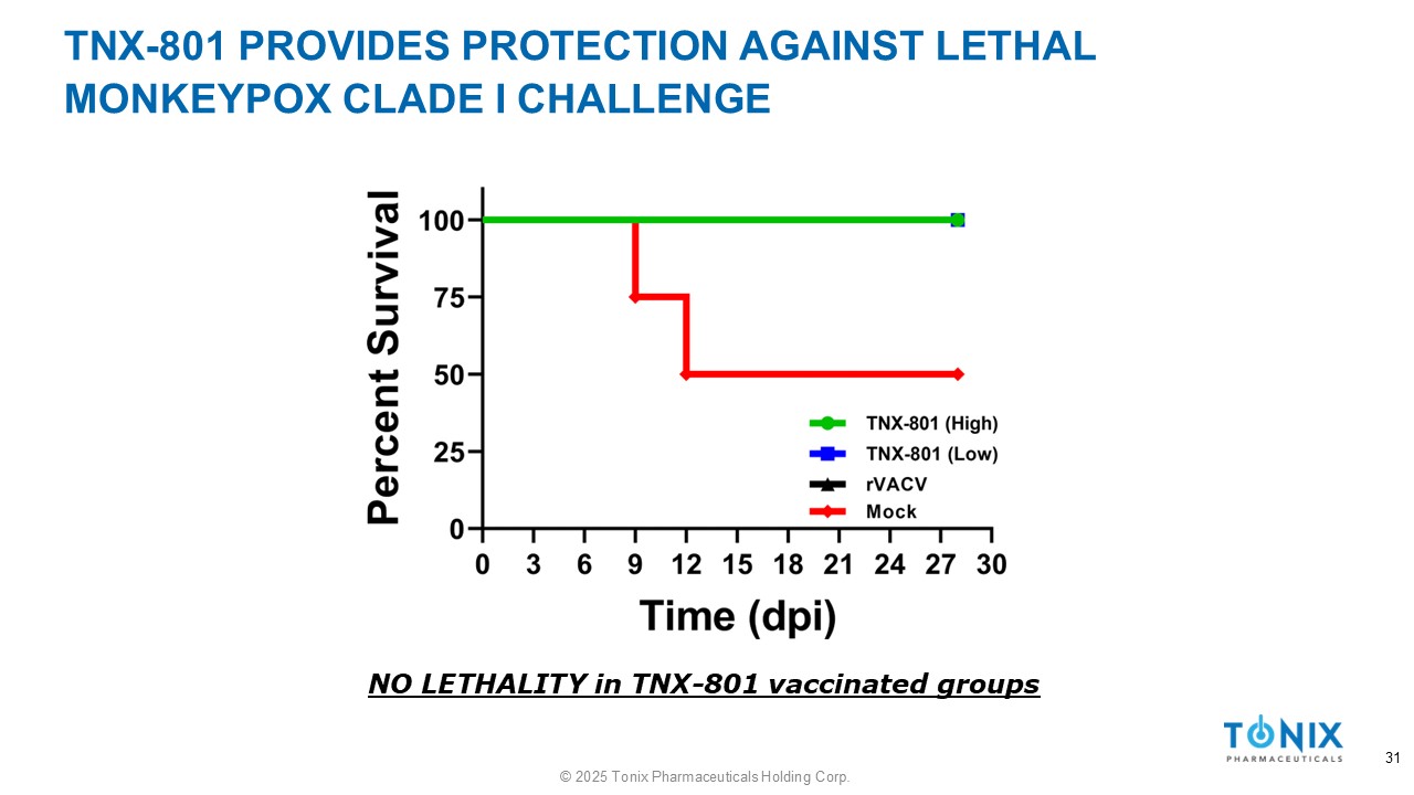 TNX - 801 PROVIDES PROTECTION AGAINST LETHAL MONKEYPOX CLADE I CHALLENGE NO LETHALITY in TNX - 801 vaccinated groups 31 © 2025 Tonix Pharmaceuticals Holding Corp.