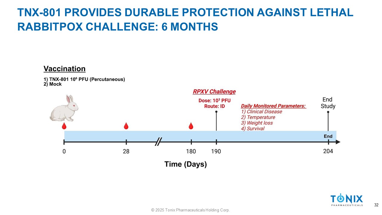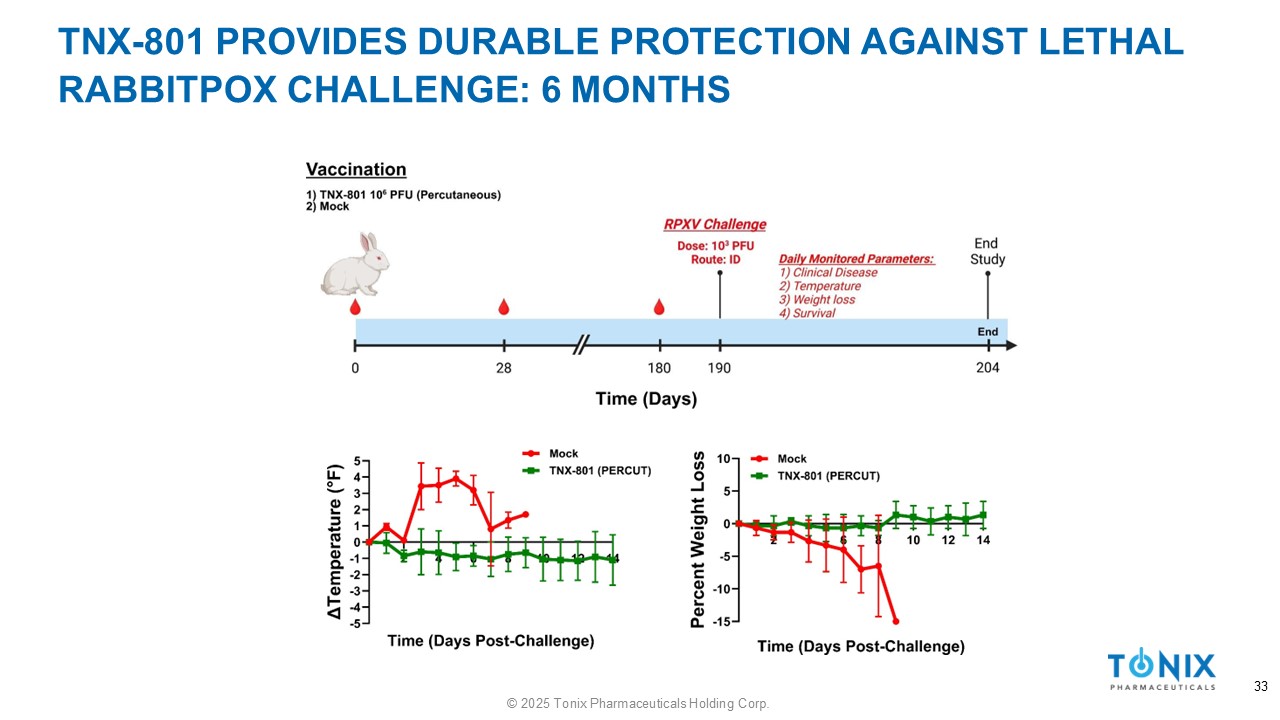 TNX - 801 PROVIDES DURABLE PROTECTION AGAINST LETHAL RABBITPOX CHALLENGE: 6 MONTHS 32 © 2025 Tonix Pharmaceuticals Holding Corp.