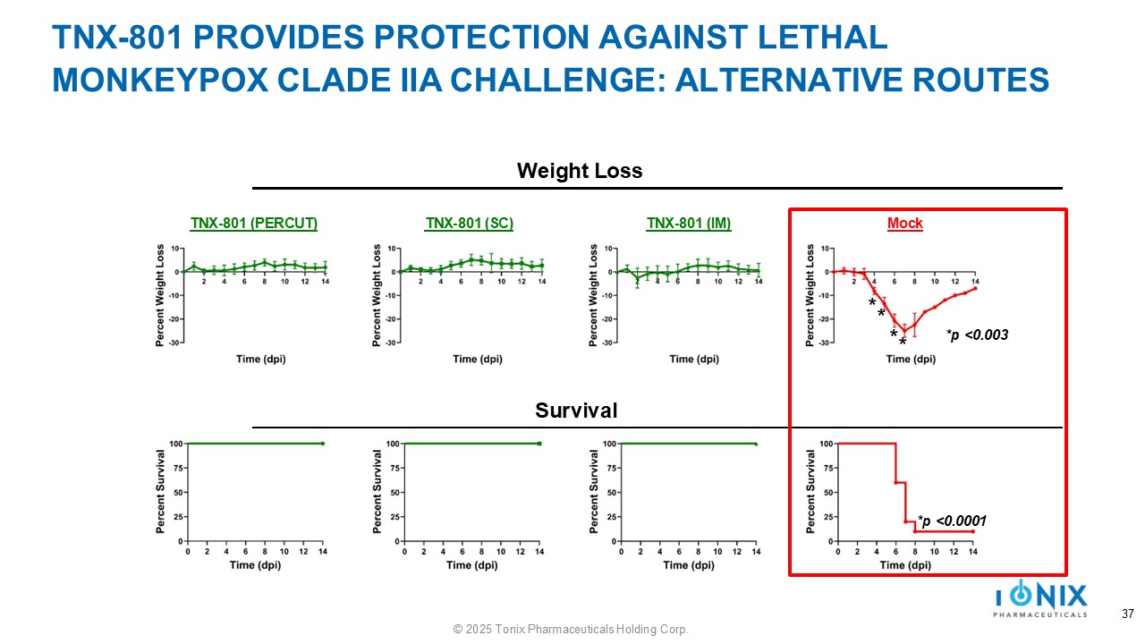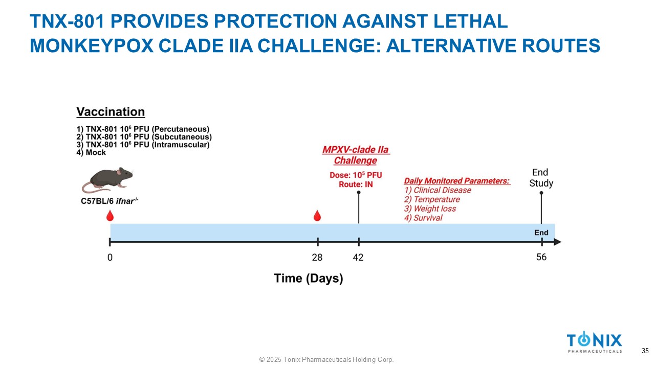 TNX - 801 PROVIDES PROTECTION AGAINST LETHAL MONKEYPOX CLADE IIA CHALLENGE: ALTERNATIVE ROUTES 35 © 2025 Tonix Pharmaceuticals Holding Corp.