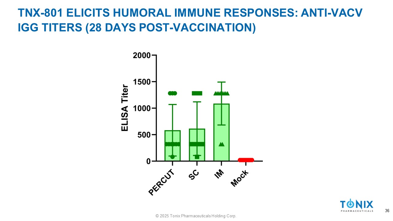TNX - 801 ELICITS HUMORAL IMMUNE RESPONSES: ANTI - VACV IGG TITERS (28 DAYS POST - VACCINATION) 36 © 2025 Tonix Pharmaceuticals Holding Corp.