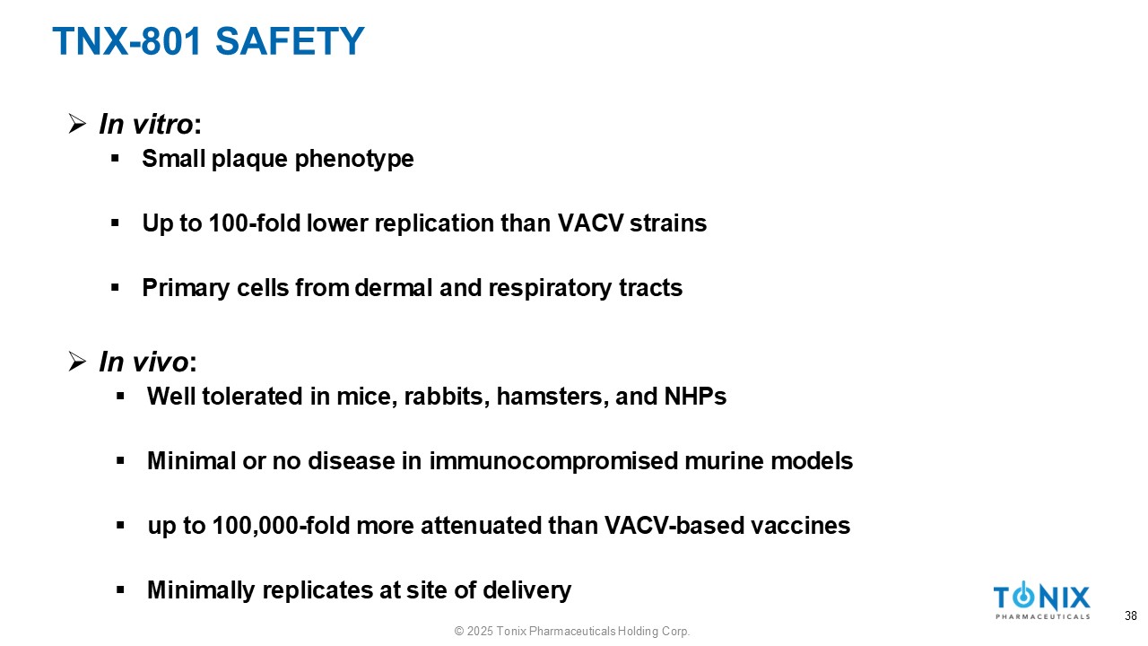 TNX - 801 PROVIDES PROTECTION AGAINST LETHAL MONKEYPOX CLADE IIA CHALLENGE: ALTERNATIVE ROUTES TNX - 801 (PERCUT) TNX - 801 (SC) TNX - 801 (IM) Mock Weight Loss Survival *p <0.0001 *p <0.003 * * * * 37 © 2025 Tonix Pharmaceuticals Holding Corp.