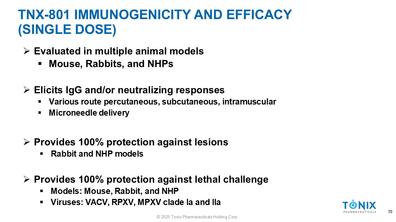 TNX - 801 SAFETY 38 © 2025 Tonix Pharmaceuticals Holding Corp. » In vitro : ▪ Small plaque phenotype ▪ Up to 100 - fold lower replication than VACV strains ▪ Primary cells from dermal and respiratory tracts » In vivo : ▪ Well tolerated in mice, rabbits, hamsters, and NHPs ▪ Minimal or no disease in immunocompromised murine models ▪ up to 100,000 - fold more attenuated than VACV - based vaccines ▪ Minimally replicates at site of delivery