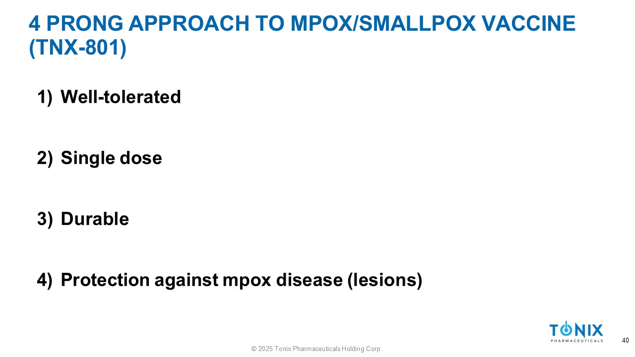 TNX - 801 IMMUNOGENICITY AND EFFICACY (SINGLE DOSE) 39 © 2025 Tonix Pharmaceuticals Holding Corp. » Evaluated in multiple animal models ▪ Mouse, Rabbits, and NHPs » Elicits IgG and/or neutralizing responses ▪ Various route percutaneous, subcutaneous, intramuscular ▪ Microneedle delivery » Provides 100% protection against lesions ▪ Rabbit and NHP models » Provides 100% protection against lethal challenge ▪ Models: Mouse, Rabbit, and NHP ▪ Viruses: VACV, RPXV, MPXV clade Ia and IIa