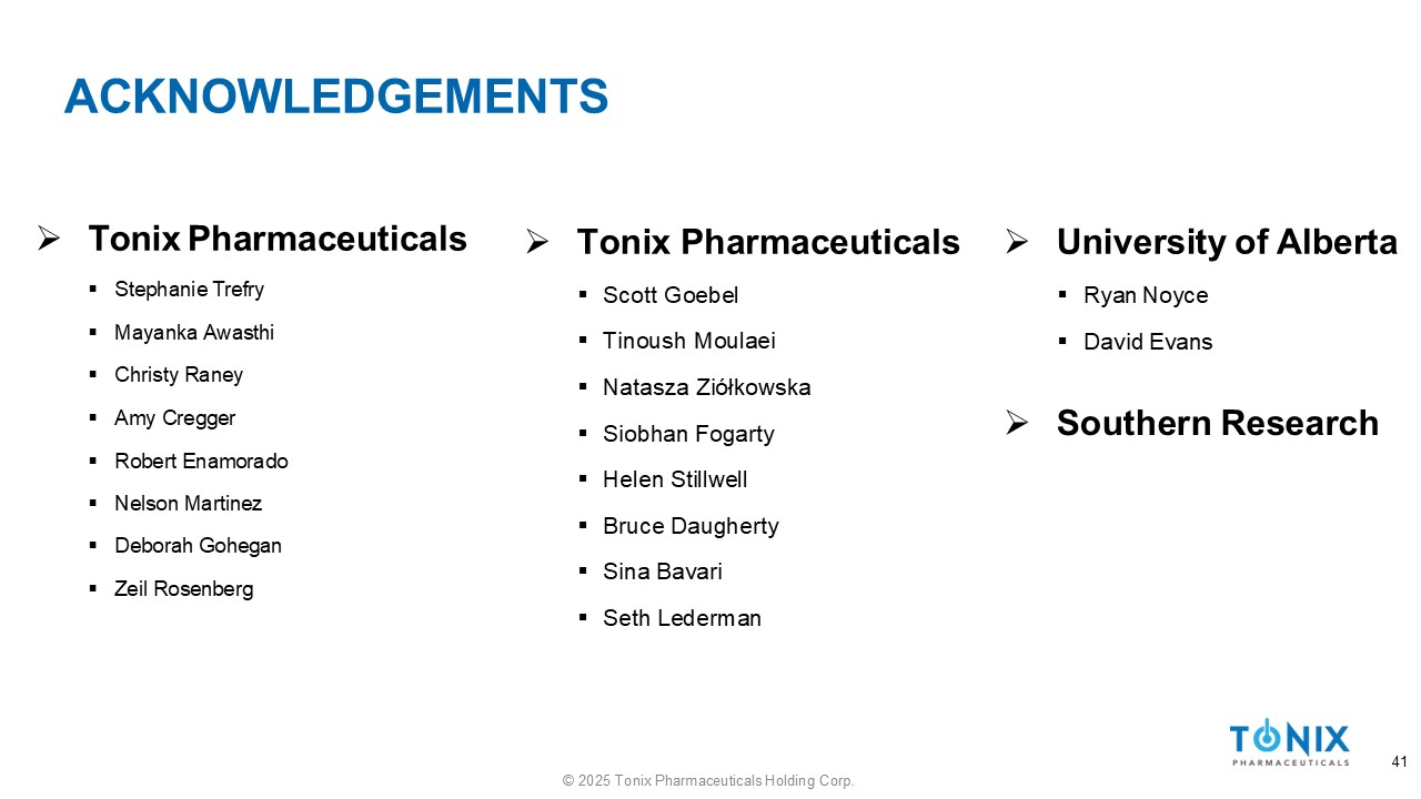 ACKNOWLEDGEMENTS 41 © 2025 Tonix Pharmaceuticals Holding Corp. » University of Alberta ▪ Ryan Noyce ▪ David Evans » Southern Research » Tonix Pharmaceuticals ▪ Scott Goebel ▪ Tinoush Moulaei ▪ Natasza Ziółkowska ▪ Siobhan Fogarty ▪ Helen Stillwell ▪ Bruce Daugherty ▪ Sina Bavari ▪ Seth Lederman » Tonix Pharmaceuticals ▪ Stephanie Trefry ▪ Mayanka Awasthi ▪ Christy Raney ▪ Amy Cregger ▪ Robert Enamorado ▪ Nelson Martinez ▪ Deborah Gohegan ▪ Zeil Rosenberg