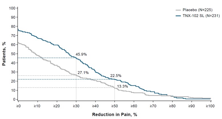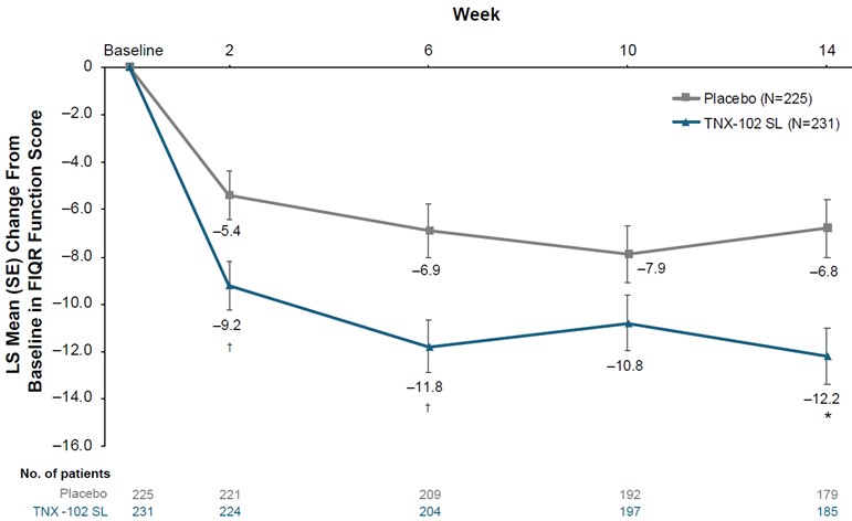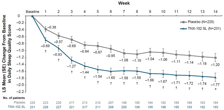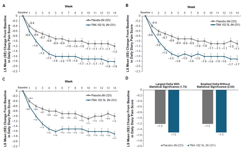 (4)A tipping point analysis was performed on the values for the primary analysis. A shift parameter was applied to the TNX-102 SL arm starting at 0.25 and increasing in increments of 0.25 through either 5 or when the outcome was no longer significant.