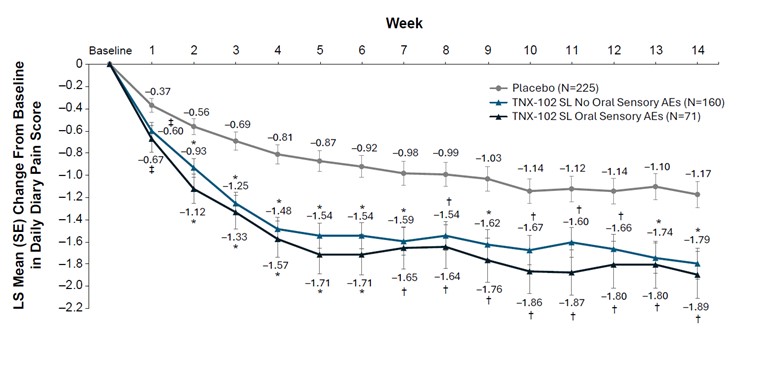 A post hoc analysis was conducted to assess the potential for unblinding among patients in the TNX-102 SL group who experienced any of the 3 common oral-sensory-related AEs that were not associated with mucosal tissue changes. The oral AEs in the preferred terms were hypoaesthesia oral (oral numbness), paraesthesia oral (oral tingling), and product taste abnormal (bitter aftertaste). In a 3-group mixed model for repeated measures approach with multiple imputation analysis, comparisons of reduction in daily pain intensity ratings were conducted comparing the entire placebo group with those who experienced any of the oral-sensory-related AEs (TNX-102 SL/oral-sensory AE subgroup) and those who did not experience any of these AEs (TNX-102 SL/no-oral-sensory AE subgroup). Additionally, the 2 TNX-102 SL subgroups, based on the presence or absence of oral sensory AEs, were compared to each other.
