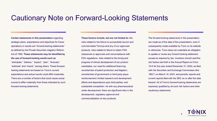 AGENDA + PARTICIPANTS Introduction, Fibromyalgia Overview & Tonmya TM Label Seth Lederman, M.D. – Chief Executive Officer and Chairman 01 02 03 Commercial and Go - To - Market Strategy Thomas Englese – EVP, Commercial & President, Tonix Medicines Q&A Seth Lederman, M.D. – Chief Executive Officer and Chairman Jessica Morris – Chief Operating Officer Gregory Sullivan, M.D. – Chief Medical Officer Thomas Englese – EVP, Commercial & President , Tonix Medicines Seth Lederman, M.D. Thomas Englese Jessica Morris Gregory Sullivan, M.D. Seth Lederman, M.D. Thomas Englese Jessica Morris Gregory Sullivan, M.D. 2