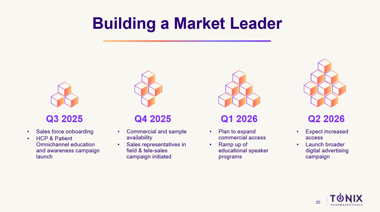 24 Payer Education & Engagement Payer Research and Value Analysis Pre - Approval Information Exchange Meetings Burden of Disease & Payer Value Proposition Traditional Pharmacy Savings Program Copay Support for Eligible Patients Digital & Text Enrollment Prior Authorization Support ACCESS PATHWAYS 1 1 Programs are for patients whom their HCP has determined Tonmya TM is appropriate for them. Robust Patient Access & Support Services On Track to be in Place at Launch Digital Pharmacy Experience Bridge Program Streamlined Enrollment & Enhanced Prior Authorization Support Free Home Delivery, Enhancing Convenience and Access