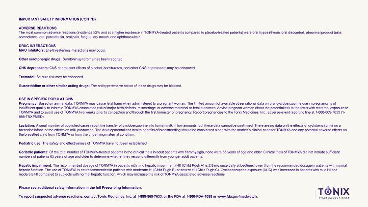 IMPORTANT SAFETY INFORMATION (CONT’D) ADVERSE REACTIONS The most common adverse reactions (incidence ≥2% and at a higher incidence in TONMYA - treated patients compared to placebo - treate d patients) were oral hypoesthesia, oral discomfort, abnormal product taste, somnolence, oral paresthesia, oral pain, fatigue, dry mouth, and aphthous ulcer. DRUG INTERACTIONS MAO inhibitors: Life - threatening interactions may occur. Other serotonergic drugs: Serotonin syndrome has been reported. CNS depressants: CNS depressant effects of alcohol, barbiturates, and other CNS depressants may be enhanced. Tramadol: Seizure risk may be enhanced. Guanethidine or other similar acting drugs: The antihypertensive action of these drugs may be blocked. USE IN SPECIFIC POPULATIONS Pregnancy: Based on animal data, TONMYA may cause fetal harm when administered to a pregnant woman. The limited amount of available obse rva tional data on oral cyclobenzaprine use in pregnancy is of insufficient quality to inform a TONMYA - associated risk of major birth defects, miscarriage, or adverse maternal or fetal outcom es. Advise pregnant women about the potential risk to the fetus with maternal exposure to TONMYA and to avoid use of TONMYA two weeks prior to conception and through the first trimester of pregnancy. Report pregnanc ies to the Tonix Medicines, Inc., adverse - event reporting line at 1 - 888 - 869 - 7633 (1 - 888 - TNXPMED). L actation: A small number of published cases report the transfer of cyclobenzaprine into human milk in low amounts, but these data canno t b e confirmed. There are no data on the effects of cyclobenzaprine on a breastfed infant, or the effects on milk production. The developmental and health benefits of breastfeeding should be conside red along with the mother’s clinical need for TONMYA and any potential adverse effects on the breastfed child from TONMYA or from the underlying maternal condition. Pediatric use: The safety and effectiveness of TONMYA have not been established. Geriatric patients: Of the total number of TONMYA - treated patients in the clinical trials in adult patients with fibromyalgia, none were 65 years of age and older. Clinical trials of TONMYA did not include sufficient numbers of patients 65 years of age and older to determine whether they respond differently from younger adult patients. Hepatic impairment: The recommended dosage of TONMYA in patients with mild hepatic impairment (HI) (Child Pugh A) is 2.8 mg once daily at bedtime, l ower than the recommended dosage in patients with normal hepatic function. The use of TONMYA is not recommended in patients with moderate HI (Child Pugh B) or severe HI (Child Pugh C ). Cyclobenzaprine exposure (AUC) was increased in patients with mild HI and moderate HI compared to subjects with normal hepatic function, which may increase the risk of TONMYA - associated adverse reaction s. Please see additional safety information in the full Prescribing Information. To report suspected adverse reactions, contact Tonix Medicines, Inc. at 1 - 888 - 869 - 7633, or the FDA at 1 - 800 - FDA - 1088 or www.fda. gov/medwatch.