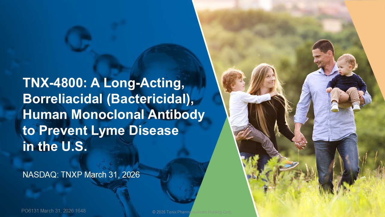© 2026 Tonix Pharmaceuticals Holding Corp. TNX - 4800: A Long - Acting , Borreliacidal (Bactericidal), Human Monoclonal Antibody to Prevent Lyme Disease in the U.S. NASDAQ: TNXP March 31, 2026 PO6131 March 31, 2026 1648
