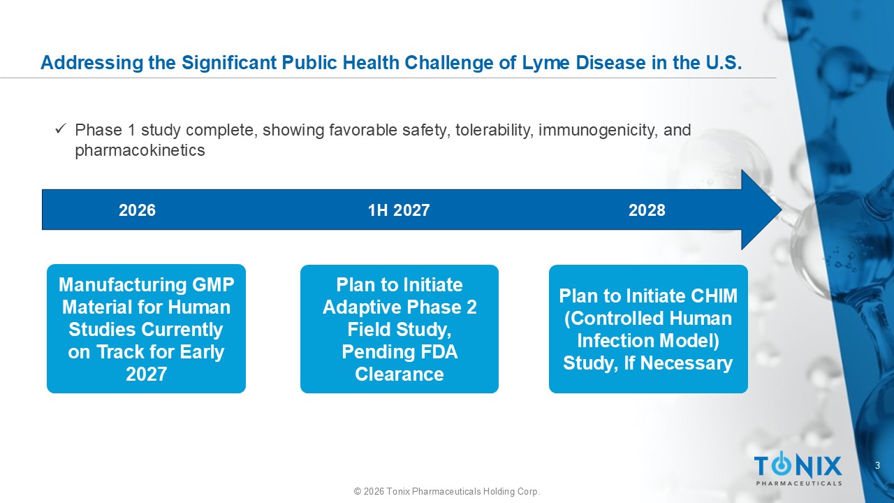 2 © 2026 Tonix Pharmaceuticals Holding Corp. Cautionary Note on Forward - Looking Statements Certain statements in this presentation are forward - looking within the meaning of the Private Securities Litigation Reform Act of 1995. These statements may be identified by the use of forward - looking words such as “anticipate,” “believe,” “forecast,” “estimate,” “expect,” and “intend,” among others. These forward - looking statements are based on Tonix's current expectations and actual results could differ materially. There are a number of factors that could cause actual events to differ materially from those indicated by such forward - looking statements. These factors include, but are not limited to, risks related to the failure to successfully launch and commercialize TONMYA ® and any of our approved products; risks related to the failure to obtain FDA clearances or approvals and noncompliance with FDA regulations; risks related to the timing and progress of clinical development of our product candidates; our need for additional financing; uncertainties of patent protection and litigation; uncertainties of government or third party payor reimbursement; limited research and development efforts and dependence upon third parties; and substantial competition. As with any pharmaceutical under development, there are significant risks in the development, regulatory approval and commercialization of new products. Tonix does not undertake an obligation to update or revise any forward - looking statement. Investors should read the risk factors set forth in the Annual Report on Form 10 - K for the year ended December 31, 2025, as filed with the Securities and Exchange Commission (the “SEC”) on March 12, 2026, and periodic reports filed with the SEC on or after the date thereof. All of Tonix's forward - looking statements are expressly qualified by all such risk factors and other cautionary statements. The information set forth herein speaks only as of the date thereof.
