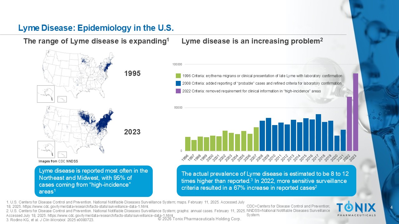 4 © 2026 Tonix Pharmaceuticals Holding Corp. 1. U.S. Centers for Disease Control and Prevention. National Notifiable Diseases Surveillance System; maps. February 11, 2025 . A ccessed July 18, 2025. https://www.cdc.gov/lyme/data - research/facts - stats/surveillance - data - 1.html. 2. U.S. Centers for Disease Control and Prevention. National Notifiable Diseases Surveillance System; graphs: annual cases. F ebr uary 11, 2025. Accessed July 18, 2025. https://www.cdc.gov/lyme/data - research/facts - stats/surveillance - data - 1.html 3. Rodino KG, et al. J Clin Microbiol . 2025:e0080723. Lyme Disease: Epidemiology in the U.S. Images from CDC NNDSS Lyme disease is reported most often in the Northeast and Midwest, with 95% of cases coming from “high - incidence” areas 1 1995 2023 The range of Lyme disease is expanding 1 0 50000 100000 1996 Criteria: erythema migrans or clinical presentation of late Lyme with laboratory confirmation 2008 Criteria: added reporting of “probable” cases and refined criteria for laboratory confirmation 2022 Criteria: removed requirement for clinical information in “high - incidence” areas Lyme disease is an increasing problem 2 The actual prevalence of Lyme disease is estimated to be 8 to 12 times higher than reported. 3 In 2022, more sensitive surveillance criteria resulted in a 67% increase in reported cases 2 CDC=Centers for Disease Control and Prevention; NNDSS=National Notifiable Diseases Surveillance System.