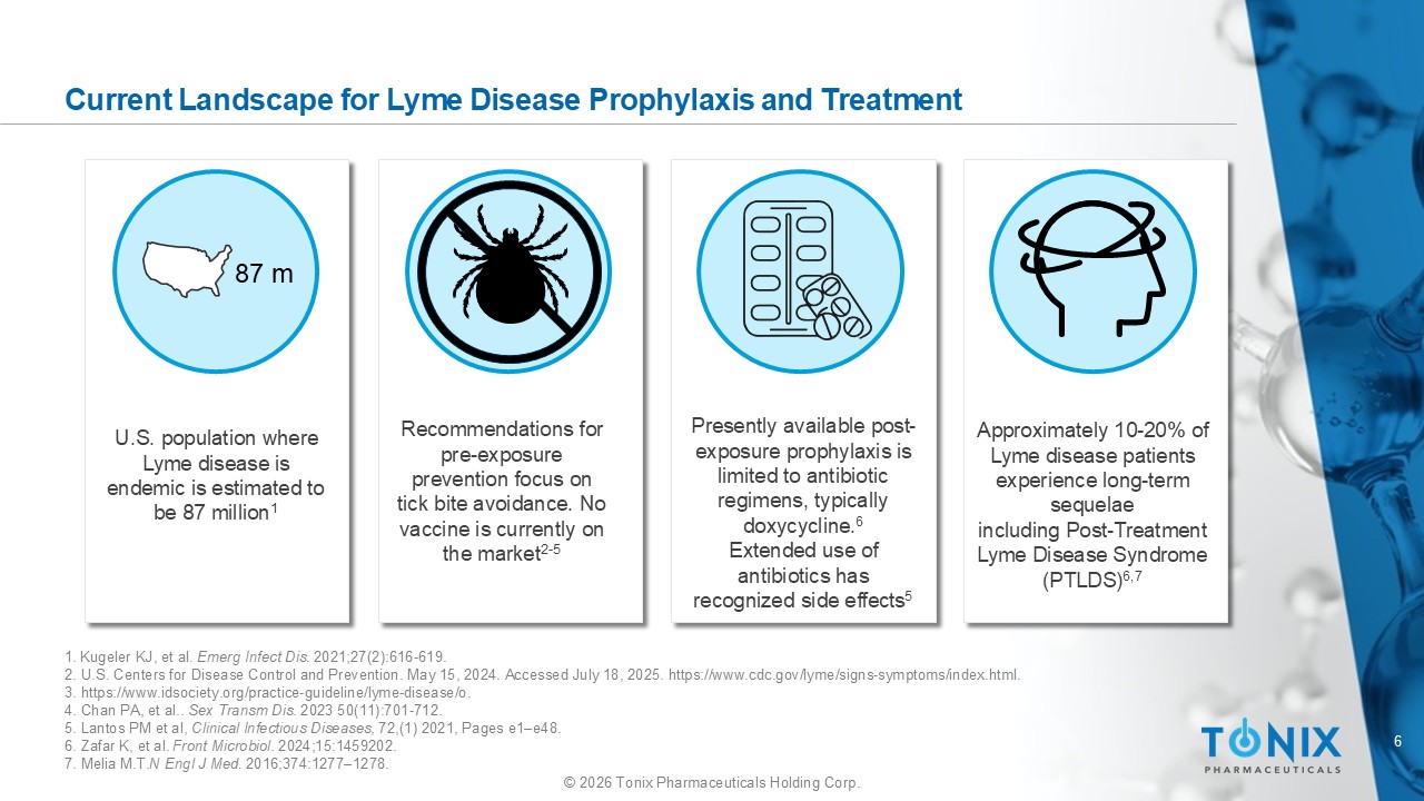 5 © 2026 Tonix Pharmaceuticals Holding Corp. Clinical Presentation: Acute Lyme Disease Headache Fever/Chills Fatigue Swollen Lymph Nodes Joint and Muscle Ache Erythema Migrans Rash There are 3 stages of Lyme disease: early, early disseminated, and late 1 Early, or acute, Lyme disease has many signs or symptoms 1,2 Erythema migrans rash is a hallmark symptom of early Lyme disease, occurring in 70% to 80% of people 1,2 • Begins at site of tick bite and expands up to 12 inches in diameter • Development is delayed, with an average of 7 days after bite • Sometimes has a “bull’s - eye” appearance 1. Cleveland Clinic. Updated August 16, 2022. Accessed July 18, 2025. https://my.clevelandclinic.org/health/diseases/11586 - lyme - disease. 2. U.S. Centers for Disease Control and Prevention. May 15, 2024. Accessed July 18, 2025. https://www.cdc.gov/lyme/signs - symptoms/index.html.