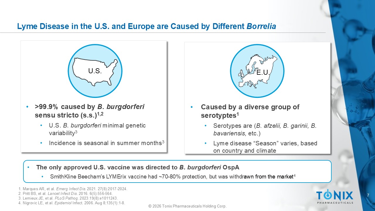 6 © 2026 Tonix Pharmaceuticals Holding Corp. c c c c Current Landscape f or Lyme Disease Prophylaxis a nd Treatment U.S. population where Lyme disease is endemic is estimated to be 87 million 1 Recommendations for pre - exposure prevention focus on tick bite avoidance. No vaccine is currently on the market 2 - 5 Presently available post - exposure prophylaxis is limited to antibiotic regimens, typically doxycycline. 6 Extended use of antibiotics has recognized side effects 5 Approximately 10 - 20% of Lyme disease patients experience long - term sequelae including Post - Treatment Lyme Disease Syndrome (PTLDS) 6,7 87 m 1. Kugeler KJ, et al. Emerg Infect Dis. 2021;27(2):616 - 619. 2. U.S. Centers for Disease Control and Prevention. May 15, 2024. Accessed July 18, 2025. https://www.cdc.gov/lyme/signs - symptom s/index.html. 3. https://www.idsociety.org/practice - guideline/lyme - disease/o. 4. Chan PA, et al.. Sex Transm Dis . 2023 50(11):701 - 712. 5. Lantos PM et al, Clinical Infectious Diseases , 72,(1) 2021, Pages e1 – e48. 6. Zafar K, et al. Front Microbiol . 2024;15:1459202. 7. Melia M.T. N Engl J Med. 2016;374:1277 – 1278.