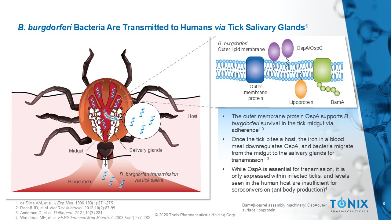 7 © 2026 Tonix Pharmaceuticals Holding Corp. c c Lyme Disease in the U.S. and Europe are Caused by Different Borrelia • >99.9% caused by B. burgdorferi sensu stricto ( s.s. ) 1,2 • U.S. B. burgdorferi minimal genetic variability 3 • Incidence is seasonal in summer months 3 1. Marques AR, et al. Emerg Infect Dis. 2021. 27(8):2017 - 2024. 2. Pritt BS, et al. Lancet Infect Dis. 2016. 6(5):556 - 564. 3. Lemieux JE, et al. PLoS Pathog . 2023.19(8):e1011243. 4. Nigrovic LE, et al. Epidemiol Infect. 2006. Aug 8;135(1):1 - 8. • Caused by a diverse group of serotyptes 1 • Serotypes are ( B. afzelii , B. garinii , B. bavariensis , etc.) • Lyme disease “Season” varies, based on country and climate • The only approved U.S. vaccine was directed to B. burgdorferi OspA • SmithKline Beecham’s LYMErix vaccine had ~70 - 80% protection, but was withdr awn from the market 4 U.S. E.U.