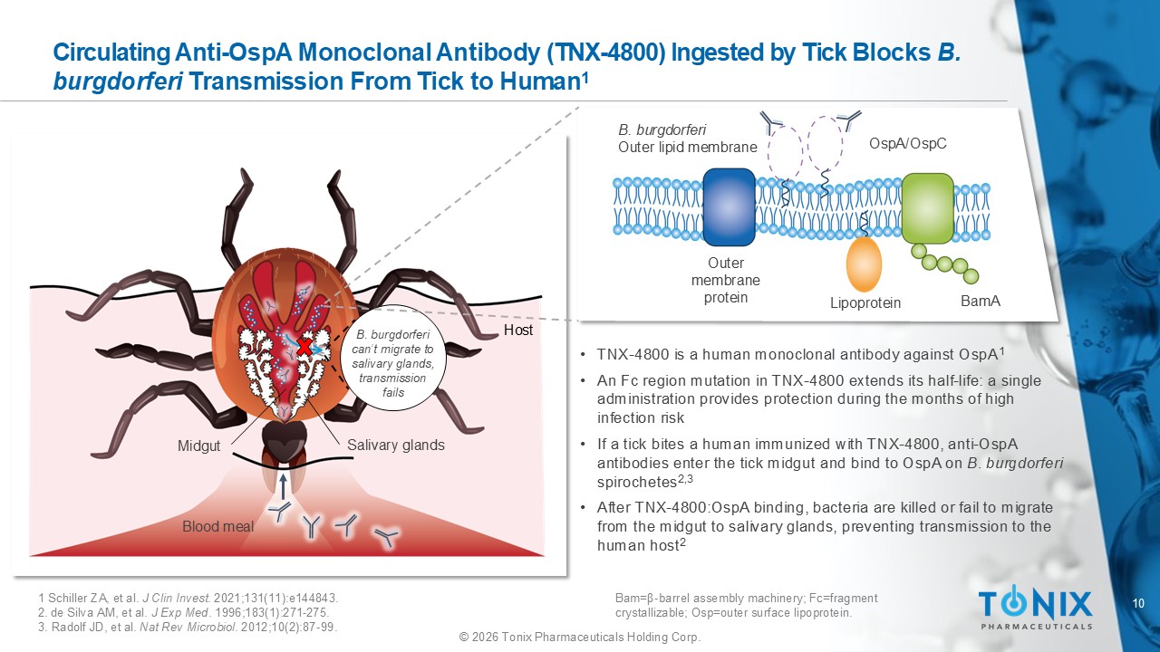 9 © 2026 Tonix Pharmaceuticals Holding Corp. OspA Facilitates Bacterial Adherence to the Tick Midgut, and Downregulation Promotes Migration to Salivary Glands for Transmission 1 - 3 Midgut Salivary glands Migration Adherence Osp =outer surface lipoprotein. 1. de Silva AM, et al. J Exp Med . 1996;183(1):271 - 275. 2. Radolf JD, et al. Nat Rev Microbiol . 2012;10(2):87 - 99. 3. Anderson C, et al. Pathogens. 2021;10(3):281. Migration Blood meal Iron - dependent OspA downregulation Midgut OspA Transmission Mouthpiece Salivary glands Mouthpiece