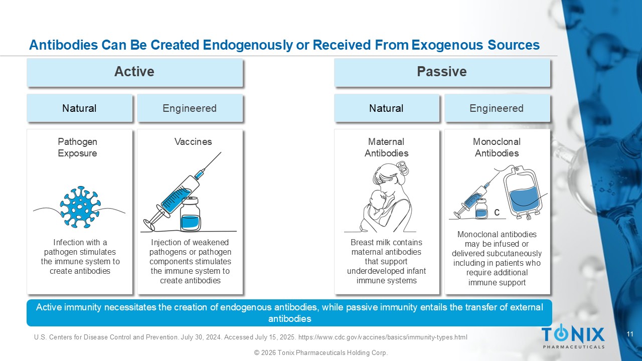 11 © 2026 Tonix Pharmaceuticals Holding Corp. Antibodies Can Be Created Endogenously o r Received From Exogenous Sources Active c c Natural Engineered Passive c c Natural Engineered Pathogen Exposure Vaccines Maternal Antibodies Monoclonal Antibodies Infection with a pathogen stimulates the immune system to create antibodies Injection of weakened pathogens or pathogen components stimulates the immune system to create antibodies Breast milk contains maternal antibodies that support underdeveloped infant immune systems Monoclonal antibodies may be infused or delivered subcutaneously including in patients who require additional immune support Active immunity necessitates the creation of endogenous antibodies, while passive immunity entails the transfer of external antibodies U.S. Centers for Disease Control and Prevention. July 30, 2024. Accessed July 15, 2025. https://www.cdc.gov/vaccines/basics/i mmu nity - types.html