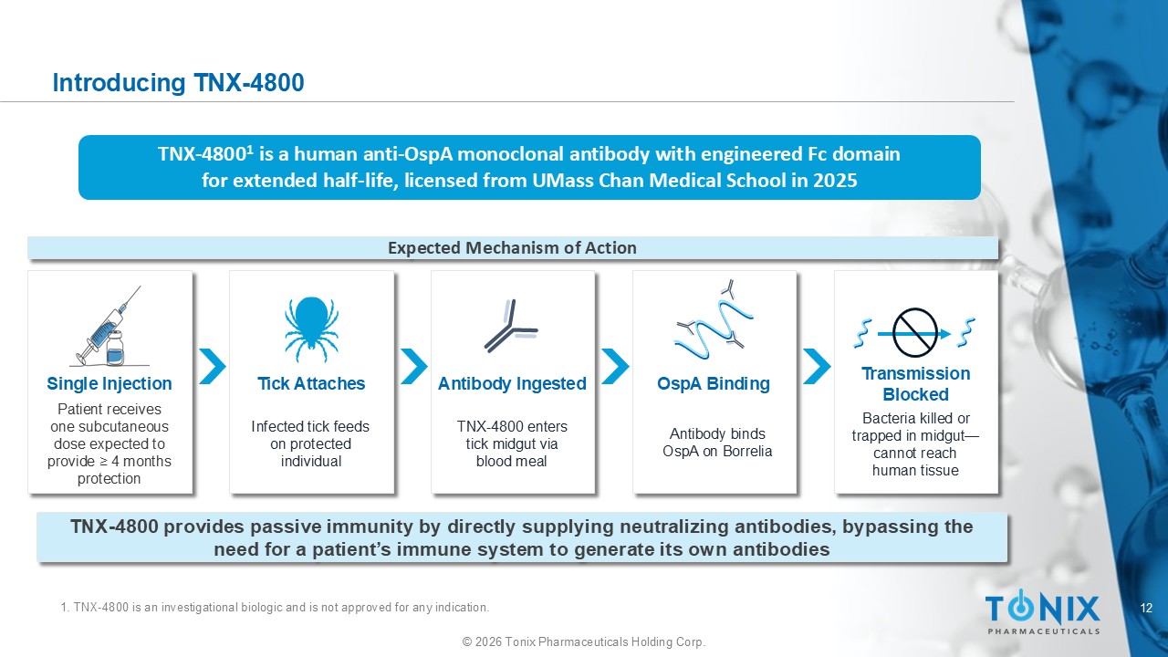 10 © 2026 Tonix Pharmaceuticals Holding Corp. Circulating Anti - O spA Monoclonal Antibody (TNX - 4800) Ingested by Tick Blocks B. b urgdorferi Transmission From Tick to Human 1 B. burgdorferi Outer lipid membrane OspA/ OspC Outer membrane protein Lipoprotein BamA Bam=β - barrel assembly machinery; Fc=fragment crystallizable; Osp =outer surface lipoprotein. • TNX - 4800 is a human monoclonal antibody against OspA 1 • An Fc region mutation in TNX - 4800 extends its half - life : a single administration provide s protection during the months of high infection risk • If a tick bites a human immunized with TNX - 4800, anti - OspA antibodies enter the tick midgut and bind to OspA on B. burgdorferi spirochetes 2,3 • After TNX - 4800:OspA binding, bacteria are killed or fail to migrate from the midgut to salivary glands, preventing transmission t o the human host 2 1 Schiller ZA, et al. J Clin Invest . 2021;131(11):e144843. 2. de Silva AM, et al. J Exp Med . 1996;183(1):271 - 275. 3. Radolf JD, et al. Nat Rev Microbiol . 2012;10(2):87 - 99. Host Midgut Salivary glands B. b urgdorferi can’t migrate to salivary glands, transmission fails Blood meal