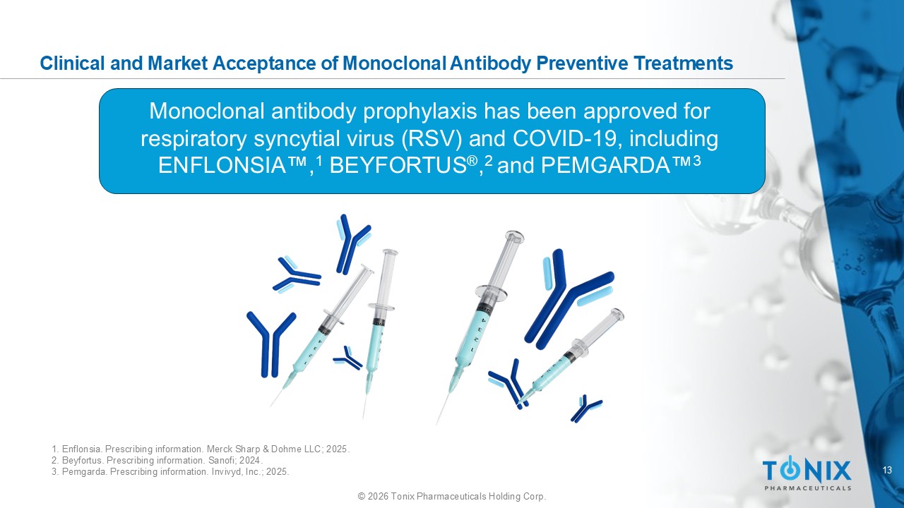 12 © 2026 Tonix Pharmaceuticals Holding Corp. Introducing TNX - 4800 TNX - 4800 1 is a human anti - OspA monoclonal antibody with engineered Fc domain for extended half - life, licensed from UMass Chan Medical School in 2025 c Single Injection Patient receives one subcutaneous dose expected to provide ≥ 4 months protection c Tick Attaches Infected tick feeds on protected individual c Antibody Ingested TNX - 4800 enters tick midgut via blood meal c OspA Binding Antibody binds OspA on Borrelia Expected Mechanism of Action c Transmission Blocked Bacteria killed or trapped in midgut — cannot reach human tissue TNX - 4800 provides passive immunity by directly supplying neutralizing antibodies, bypassing the need for a patient’s immune system to generate its own antibodies 1. TNX - 4800 is an investigational biologic and is not approved for any indication.