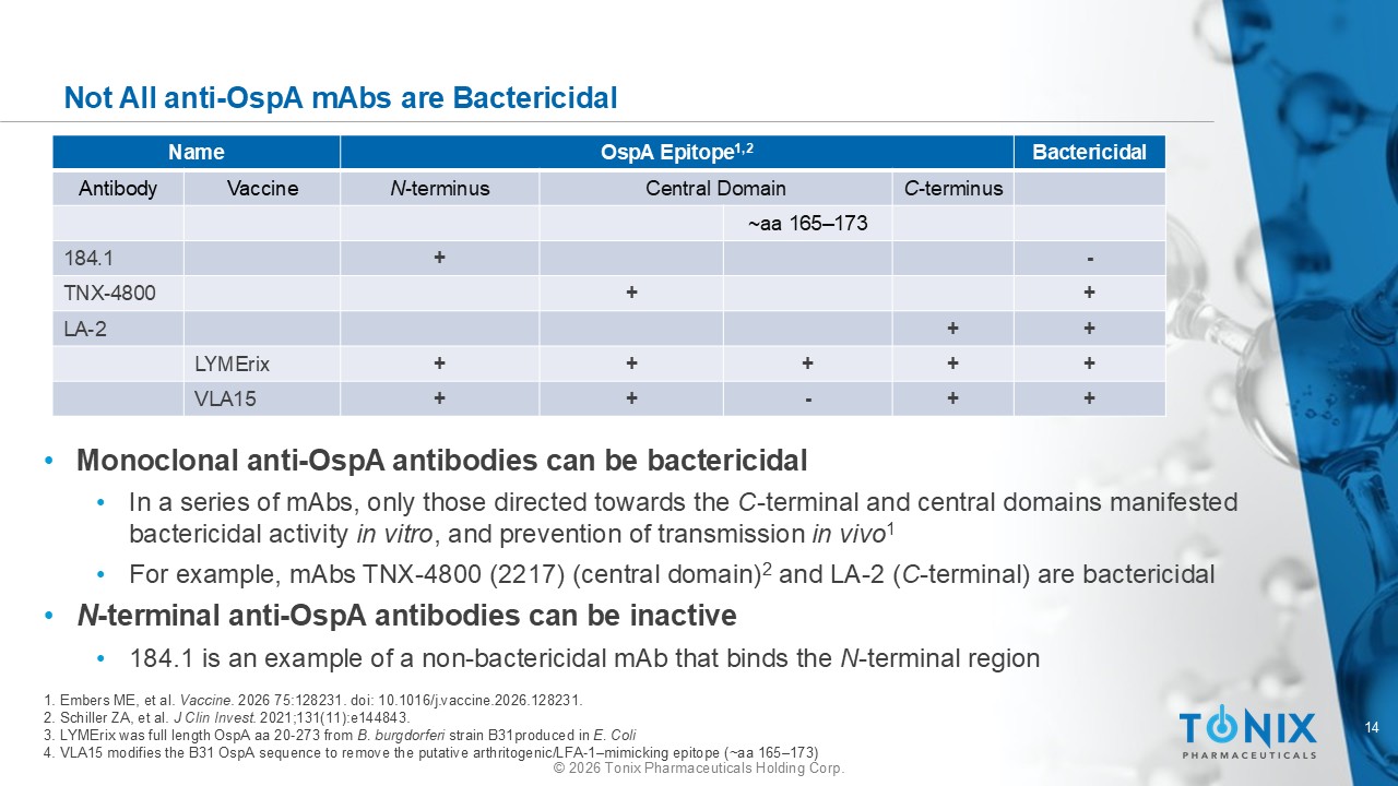 14 © 2026 Tonix Pharmaceuticals Holding Corp. Not All anti - OspA mAbs are Bactericidal 1. Embers ME, et al. Vaccine . 2026 75:128231. doi : 10.1016/j.vaccine.2026.128231. 2. Schiller ZA, et al. J Clin Invest . 2021;131(11):e144843. 3. LYMErix was full length OspA aa 20 - 273 from B. burgdorferi strain B31produced in E. Coli 4. VLA15 modifies the B31 OspA sequence to remove the putative arthritogenic/LFA - 1 – mimicking epitope (~aa 165 – 173) Bactericidal OspA Epitope 1,2 Name C - terminus Central Domain N - terminus Vaccine Antibody ~aa 165 – 173 - + 184.1 + + TNX - 4800 + + LA - 2 + + + + + LYMErix + + - + + VLA15 • Monoclonal anti - OspA antibodies can be bactericidal • In a series of mAbs , only those directed towards the C - terminal and central domains manifested bactericidal activity in vitro , and prevention of transmission in vivo 1 • For example, mAbs TNX - 4800 (2217) (central domain) 2 and LA - 2 ( C - terminal) are bactericidal • N - terminal anti - OspA antibodies can be inactive • 184.1 is an example of a non - bactericidal mAb that binds the N - terminal region