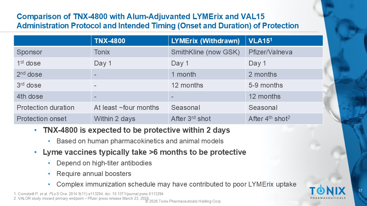 16 © 2026 Tonix Pharmaceuticals Holding Corp. Comparison of TNX - 4800 with Alum - Adjuvanted Subunit Vaccines LYMErix (Withdrawn) and VLA15 (in Development) in Terms of OspA Targeting 1. Marques AR, et al. Emerg Infect Dis. 2021. 27(8):2017 - 2024. doi : 10.3201/eid2708.204763. 2. Pritt BS, et al. Lancet Infect Dis. 2016. 6(5):556 - 564. doi : 10.1016/S1473 - 3099(15)00464 - 8. 3. Lemieux JE, et al. PLoS Pathog . 2023.19(8):e1011243. doi : 10.1371/journal.ppat.1011243. 4. Comstedt P, et al. PLoS One. 2014 9(11):e113294. doi : 10.1371/journal.pone.0113294. *VLA15 contains 3 OspA’s from different garinii genospecies. VLA15 1 - 4 LYMErix 1 - 4 TNX - 4800 Pfizer/Valneva SmithKline (GSK) Tonix Sponsor In Development Withdrawn In Development Status Vaccine Vaccine Monoclonal Antibody Type Active Active Passive Immunity EU + U.S. U.S. U.S. Target Market EU + U.S. U.S. U.S. Clinical Trials B. burgdorferi (U.S.) B. afzelii (Europe) B. garinii * (Europe) B. Bavariensis (Europe) B. burgdorferi (U.S.) B. burgdorferi (U .S.) Borrelia targeted
