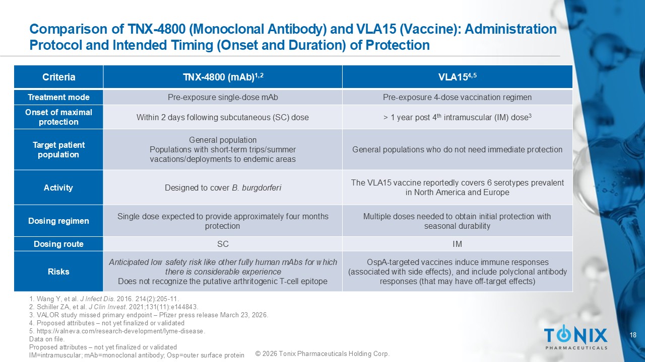 17 © 2026 Tonix Pharmaceuticals Holding Corp. Comparison of TNX - 4800 with Alum - Adjuvanted LYMErix and VAL15 Administration Protocol and Intended Timing (Onset and Duration) of Protection 1. Comstedt P, et al. PLoS One. 2014 9(11):e113294. doi : 10.1371/journal.pone.0113294 2. VALOR study missed primary endpoint – Pfizer press release March 23, 2026. VLA15 1 LYMErix (Withdrawn) TNX - 4800 Pfizer/Valneva SmithKline (now GSK) Tonix Sponsor Day 1 Day 1 Day 1 1 st dose 2 months 1 month - 2 nd dose 5 - 9 months 12 months - 3 rd dose 12 months - - 4th dose Seasonal Seasonal At least ~four months Protection duration After 4 th shot 2 After 3 rd shot Within 2 days Protection onset • TNX - 4800 is expected to be protective within 2 days • Based on human pharmacokinetics and animal models • Lyme vaccines typically take >6 months to be protective • Depend on high - titer antibodies • Require annual boosters • Complex immunization schedule may have contributed to poor LYMErix uptake