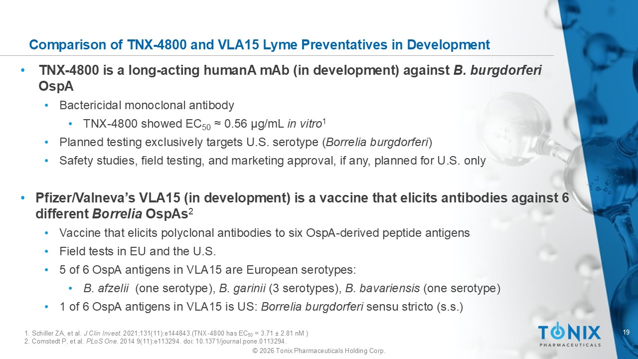 18 © 2026 Tonix Pharmaceuticals Holding Corp. Comparison of TNX - 4800 (Monoclonal Antibody) and VLA15 ( Vaccine) : Administration Protocol and Intended Timing (Onset and Duration) of Protection VLA15 4,5 TNX - 4800 ( mAb ) 1,2 Criteria Pre - exposure 4 - dose vaccination regimen Pre - exposure single - dose mAb Treatment mode > 1 year post 4 th intramuscular (IM) dose 3 Within 2 days following subcutaneous (SC) dose Onset of maximal protection General populations who do not need immediate protection General population Populations with short - term trips/summer vacations/deployments to endemic areas Target patient population The VLA15 vaccine reportedly covers 6 serotypes prevalent in North America and Europe Designed to cover B. burgdorferi Activity Multiple doses needed to obtain initial protection with seasonal durability Single dose expected to provide approximately four months protection Dosing regimen IM SC Dosing route OspA - targeted vaccines induce immune responses (associated with side effects), and include polyclonal antibody responses (that may have off - target effects) Anticipated low safety risk like other fully human mAbs for which there is considerable experience Does not recognize the putative arthritogenic T - cell epitope Risks 1. Wang Y, et al. J Infect Dis. 2016. 214(2):205 - 11. 2. Schiller ZA, et al. J Clin Invest . 2021;131(11):e144843. 3. VALOR study missed primary endpoint – Pfizer press release March 23, 2026. 4. Proposed attributes – not yet finalized or validated 5. https://valneva.com/research - development/lyme - disease. Data on file. Proposed attributes – not yet finalized or validated IM=intramuscular; mAb =monoclonal antibody; Osp =outer surface protein