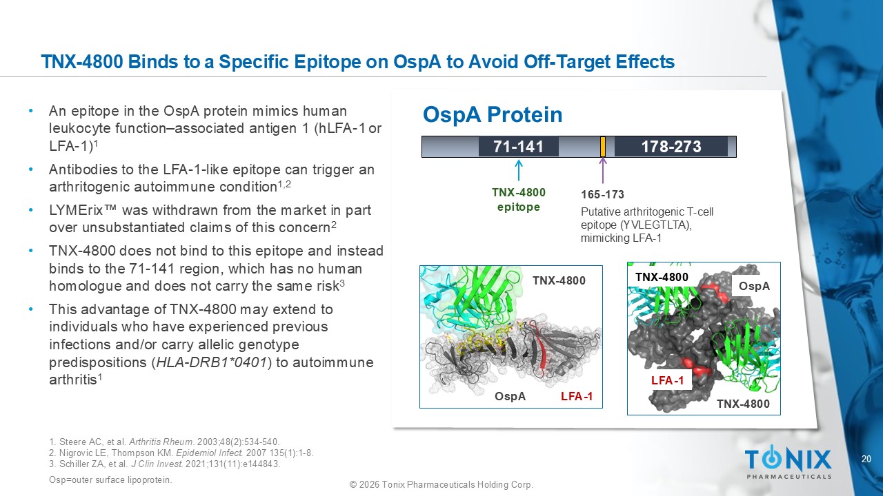 19 © 2026 Tonix Pharmaceuticals Holding Corp. Comparison of TNX - 4800 and VLA15 Lyme Preventatives in Development • TNX - 4800 is a long - acting humanA mAb (in development) against B. burgdorferi OspA • Bactericidal monoclonal antibody • TNX - 4800 showed EC 50 ≈ 0.56 μ g/mL in vitro 1 • Planned testing exclusively targets U.S. serotype ( Borrelia burgdorferi ) • Safety studies, field testing, and marketing approval, if any, planned for U.S. only • Pfizer/Valneva’s VLA15 (in development) is a vaccine that elicits antibodies against 6 different Borrelia OspAs 2 • Vaccine that elicits polyclonal antibodies to six OspA - derived peptide antigens • Field tests in EU and the U.S. • 5 of 6 OspA antigens in VLA15 are European serotypes: • B. afzelii (one serotype), B. garinii (3 serotypes), B. bavariensis (one serotype) • 1 of 6 OspA antigens in VLA15 is US: Borrelia burgdorferi sensu stricto ( s.s. ) 1. Schiller ZA, et al. J Clin Invest . 2021;131(11):e144843.(TNX - 4800 has EC 50 = 3.71 ± 2.81 nM ) 2. Comstedt P, et al. PLoS One. 2014 9(11):e113294. doi : 10.1371/journal.pone.0113294.