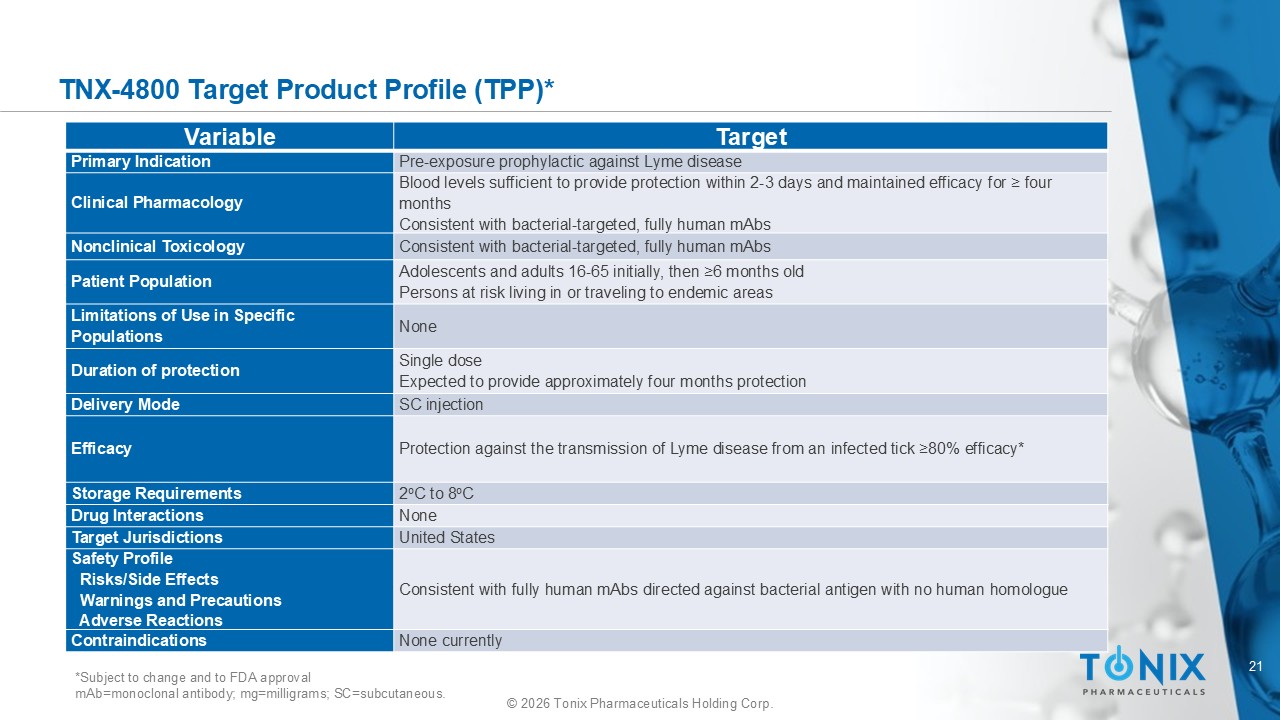 20 © 2026 Tonix Pharmaceuticals Holding Corp. TNX - 4800 Binds t o a Specific Epitope o n OspA to Avoid Off - Target Effects 178 - 273 71 - 141 TNX - 4800 e pitope 165 - 173 Putative arthritogenic T - cell epitope (YVLEGTLTA), mimicking LFA - 1 178 - 273 OspA Protein 1. S teere AC, et al. Arthritis Rheum . 2003;48(2):534 - 540. 2. Nigrovic LE, Thompson KM. Epidemiol Infect. 2007 135(1):1 - 8. 3. Schiller ZA, et al. J Clin Invest . 2021;131(11):e144843. • An epitope in the OspA protein mimics human leukocyte function – associated antigen 1 (hLFA - 1 or LFA - 1) 1 • Antibodies to the LFA - 1 - like epitope can trigger an arthritogenic autoimmune condition 1,2 • LYMErix was withdrawn from the market in part over unsubstantiated claims of this concern 2 • TNX - 4800 does not bind to this epitope and instead binds to the 71 - 141 region, which has no human homologue and does not carry the same risk 3 • This advantage of TNX - 4800 may extend to individuals who have experienced previous infections and/or carry allelic genotype predispositions ( HLA - DRB1*0401 ) to autoimmune arthritis 1 OspA TNX - 4800 LFA - 1 LFA - 1 OspA TNX - 4800 TNX - 4800 Osp =outer surface lipoprotein.