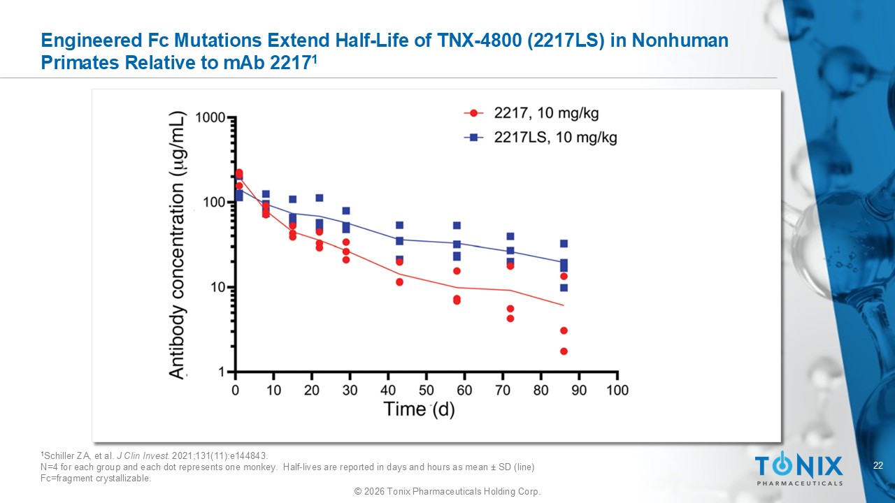 22 © 2026 Tonix Pharmaceuticals Holding Corp. Engineered Fc Mutations Extend Half - Life of TNX - 4800 (2217LS) in Nonhuman Primates Relative to mAb 2217 1 1 Schiller ZA, et al. J Clin Invest . 2021;131(11):e144843. N=4 for each group and each dot represents one monkey. Half - lives are reported in days and hours as mean ± SD (line) Fc=fragment crystallizable.
