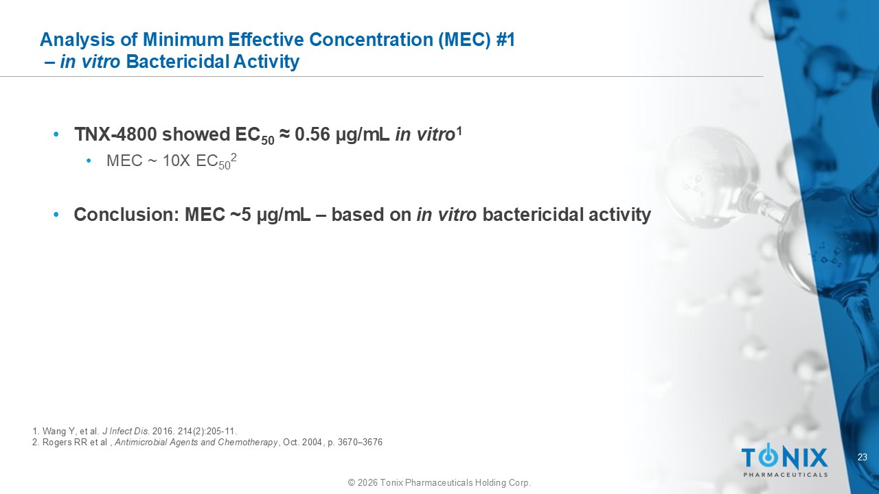 23 © 2026 Tonix Pharmaceuticals Holding Corp. Analysis of Minimum Effective Concentration (MEC) #1 – in vitro Bactericidal Activity 1. Wang Y, et al. J Infect Dis. 2016. 214(2):205 - 11. 2. Rogers RR et al , Antimicrobial Agents and Chemotherapy , Oct. 2004, p. 3670 – 3676 • TNX - 4800 showed EC 50 ≈ 0.56 μ g/mL in vitro 1 • MEC ~ 10X EC 50 2 • Conclusion: MEC ~ 5 μ g/mL – based on in vitro bactericidal activity