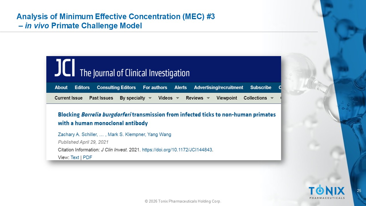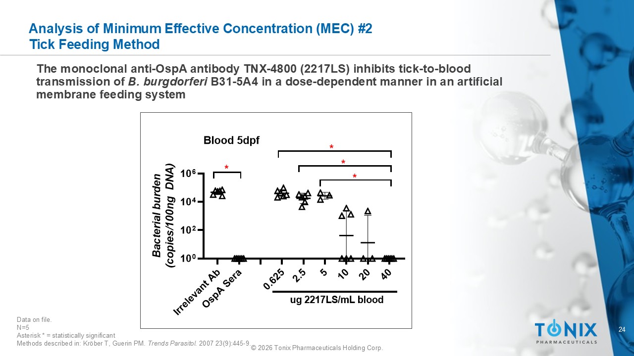 24 © 2026 Tonix Pharmaceuticals Holding Corp. Analysis of Minimum Effective Concentration (MEC) #2 Tick Feeding Method The monoclonal anti - OspA antibody TNX - 4800 (2217LS) inhibits tick - to - blood transmission of B. burgdorferi B31 - 5A4 in a dose - dependent manner in an artificial membrane feeding system I r r e l e v a n t A b O s p A S e r a 0 . 6 2 5 2 . 5 5 1 0 2 0 4 0 10 0 10 2 10 4 10 6 B a c t e r i a l b u r d e n ( c o p i e s / 1 0 0 n g D N A ) * * * * ug 2217LS/mL blood Blood 5dpf Data on file. N=5 Asterisk * = statistically significant Methods described in: Kröber T, Guerin PM. Trends Parasitol . 2007 23(9):445 - 9.